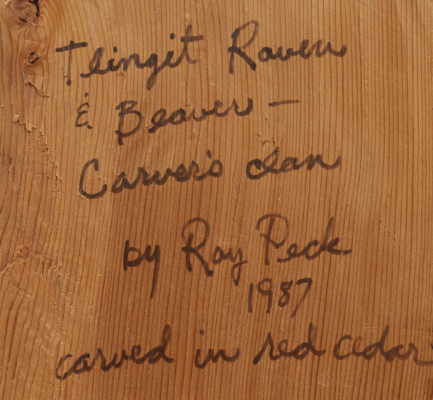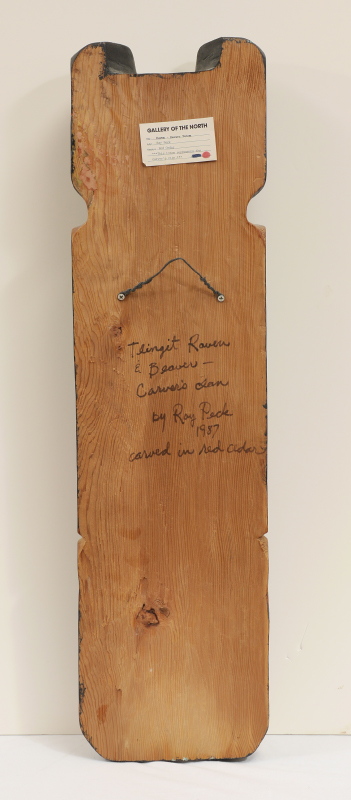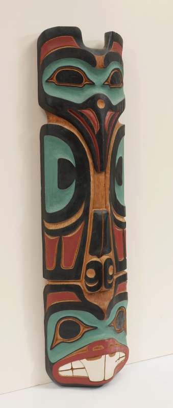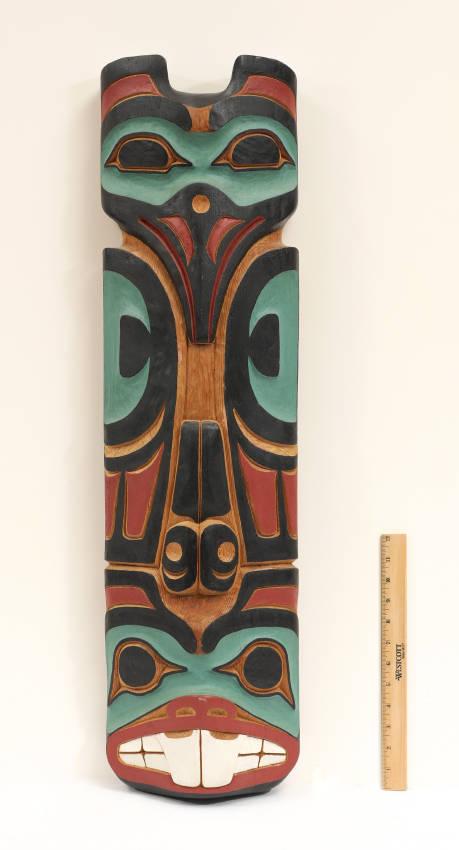 PECK, Ray, (Tlingit, 20th Century): Polychrome decorated Northwest Raven Beaver wall totem, carved from red cedar, signed on back. This totem represents the carver's clan, overall measures 34 3/4'' h. x 9 1/4'' x 3 1/4''.