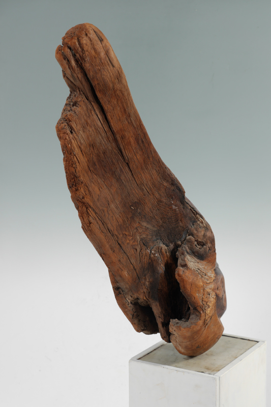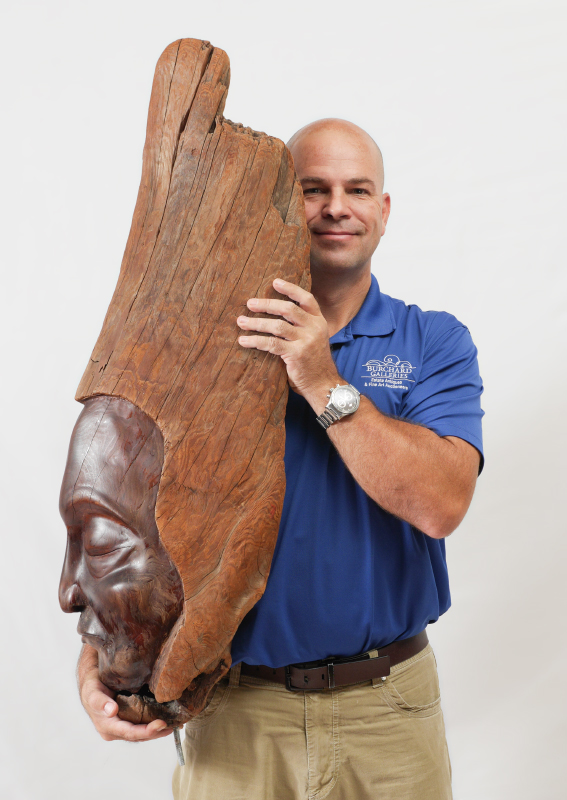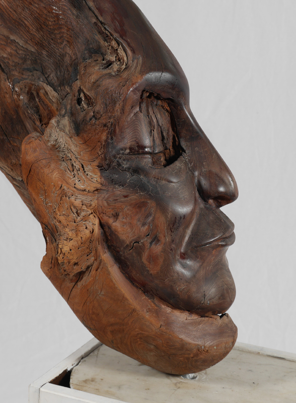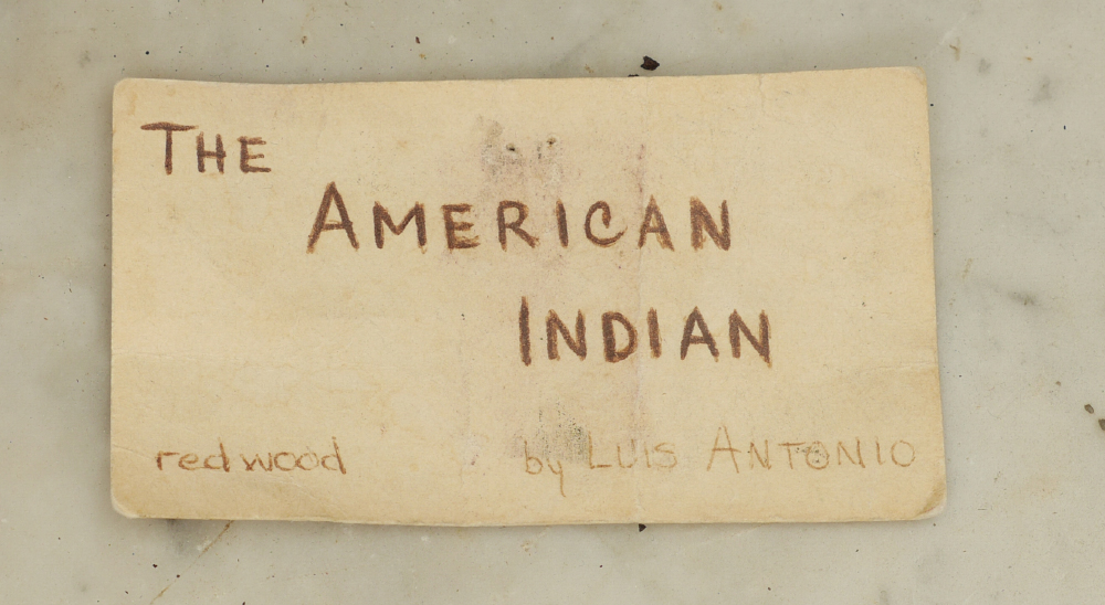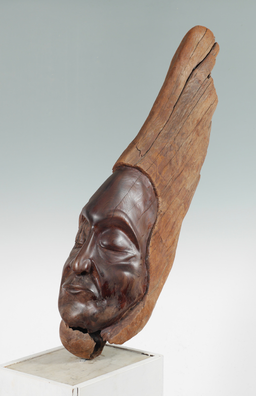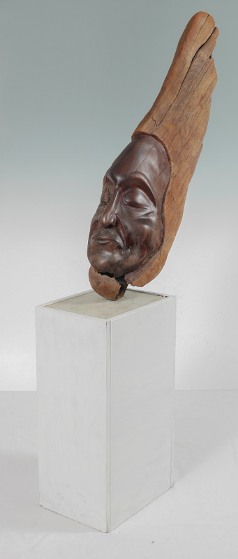 ANTONIO, Luis, (American, 20th Century): Driftwood carving bust of Native American man with stone and wood pedestal base. Overall assembled approx. 38 1/4'' x 29'' x 10 1/4''. Bust measures approx. 35'' h. x 22 1/2'' x 7'', base 24'' x 10 1/4'' x 13 1/4''.