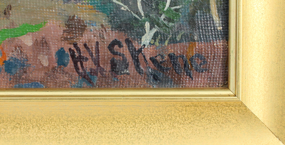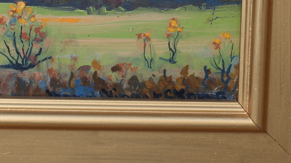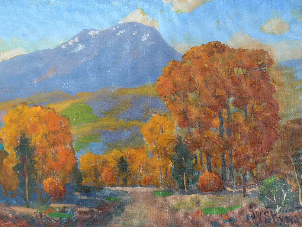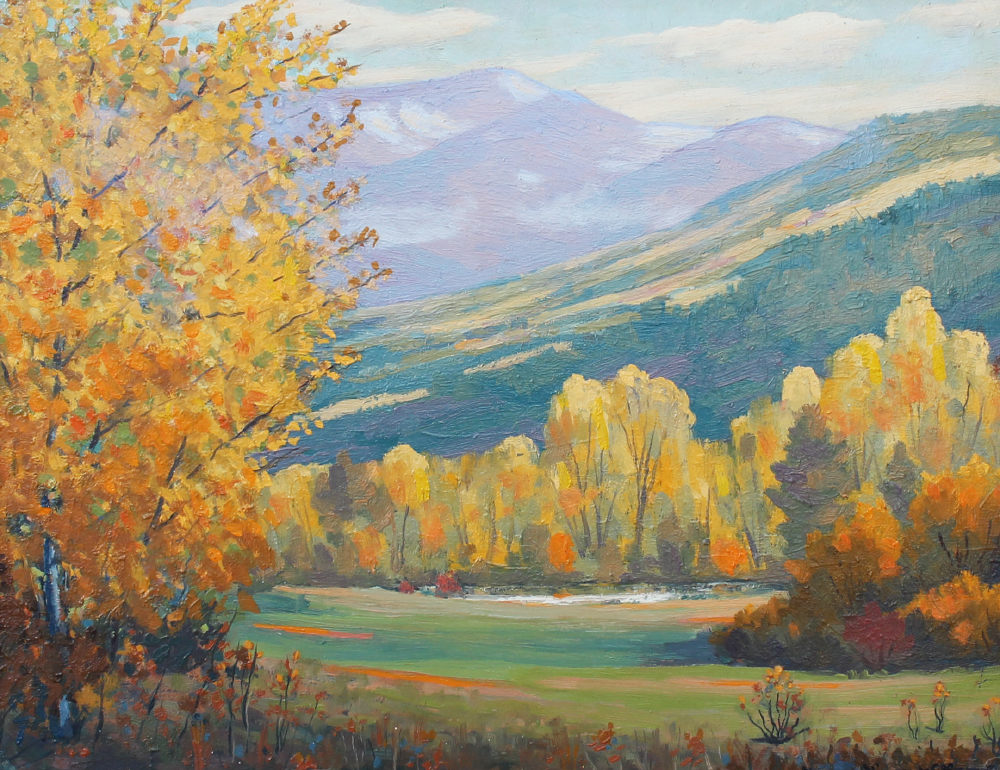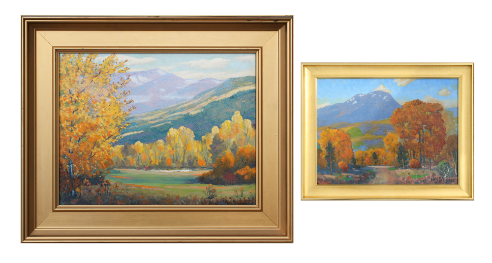 SKENE, Harold, (American, 1883-1978): 1) Autumnal Landscape with Mountains in Distance, Oil/Canvasboard, 11.5'' x 15.5'', signed lower right, framed, 15'' x 19''; 2) Misty Range, Oil/Board, sight size 13.25'' x 17.25'', signed lower right, framed, 19.25'' x 23.25''.