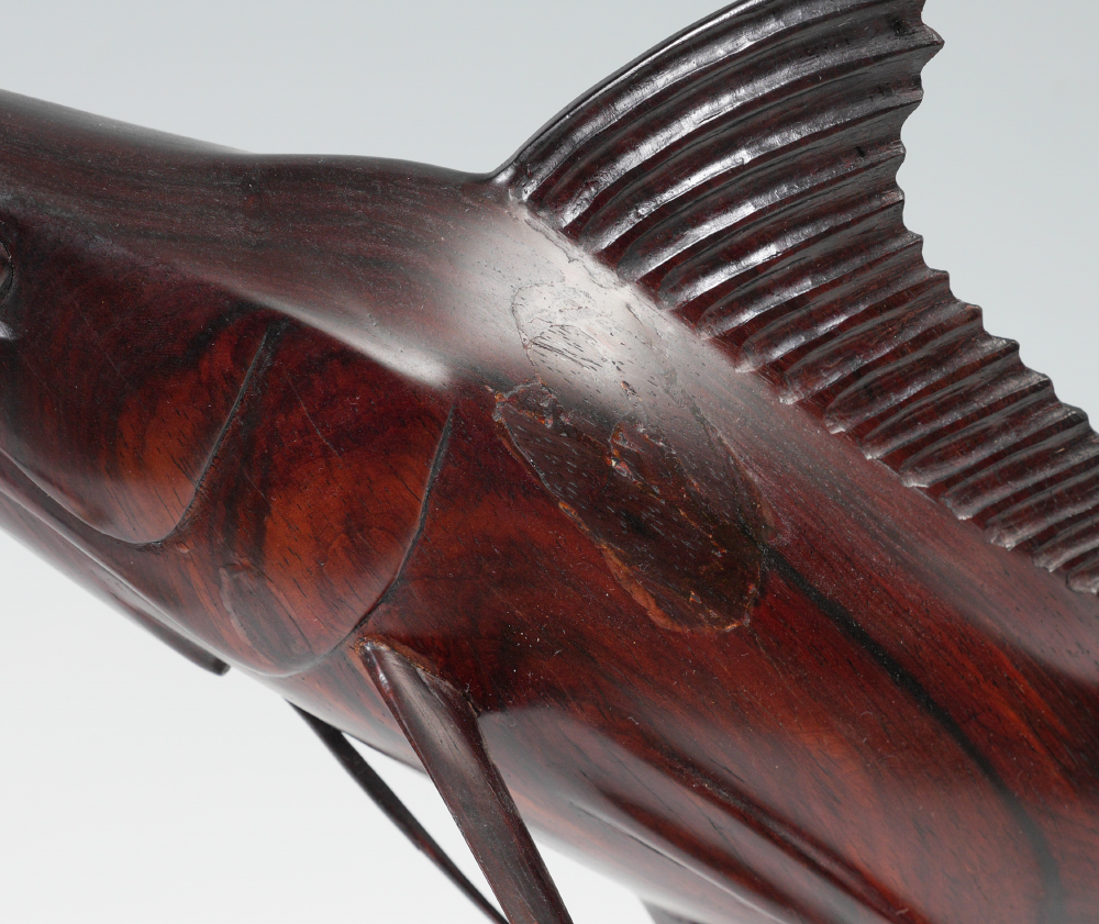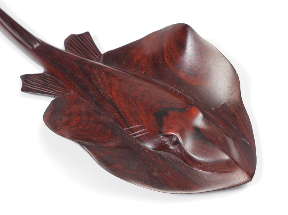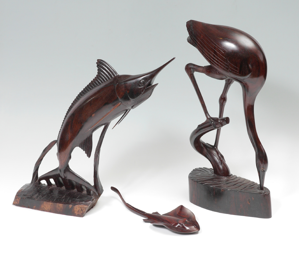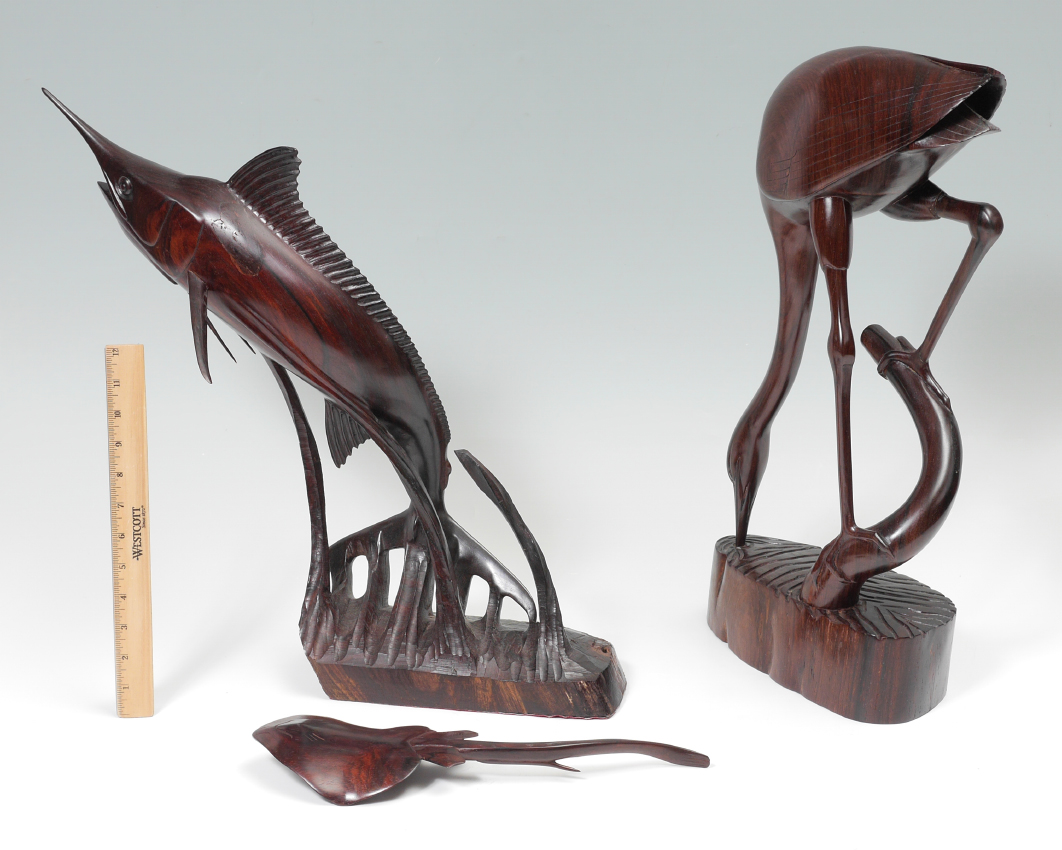 3 CENTRAL AMERICAN COCOBOLO WOOD CARVINGS: 3 pieces total to include 1) Sailfish, illegibly signed Chafh? Panama, 19 1/4'' h. x 20'' x 5''. 2) Crane with head down, signed Frederico M., 21 1/2'' h. x 13'' x 5''. 3) Stingray, signed Jubev, 1 1/4'' h. x 14 1/4'' x 4 3/4''.