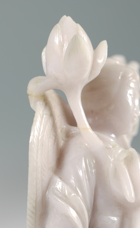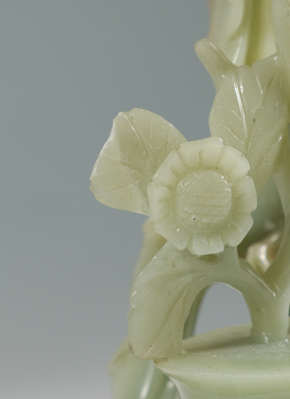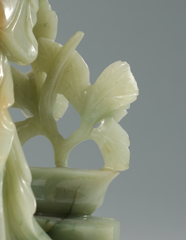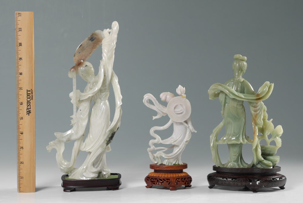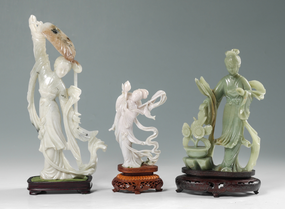 3 CHINESE CARVED STONE FIGURES: 3 pieces total, each affixed to carved wood stands, to include 1) Green stone figure of a woman in flowing robes with flower pot, 9 1/2'' h. x 5 1/2'' x 3 1/4''. 2) White stone of woman dancing with a fan, 11 1/2'' h. 3) Figure of woman holding flower and fishing pole with fish, 7 1/4'' h.