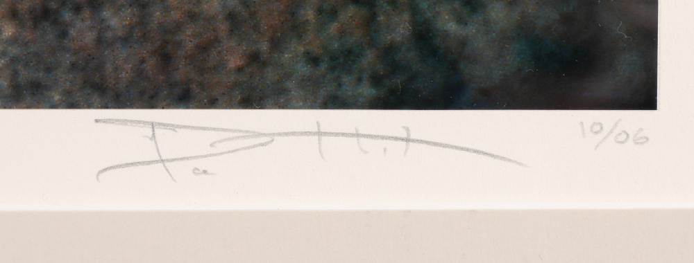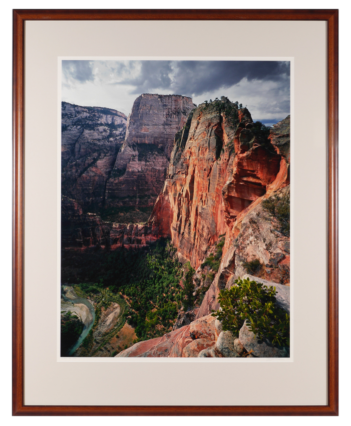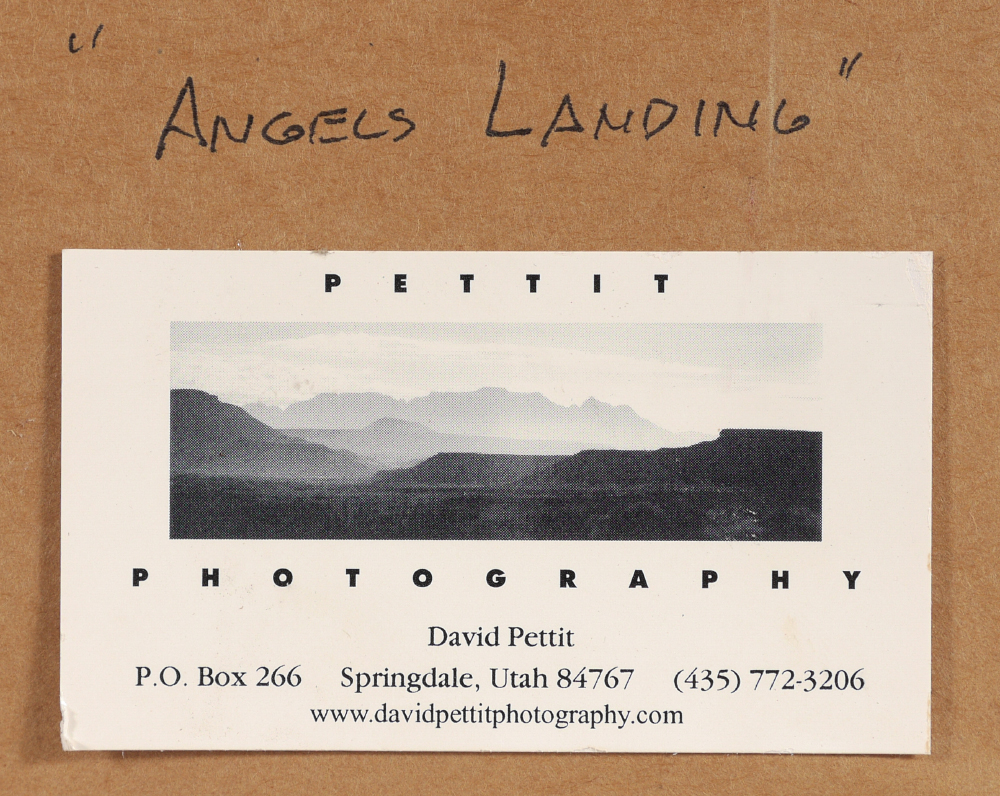 PETTIT, David, (American, 20th C.): ''Angel's Landing'', Photographic Print, 38'' x 29.75'', pencil signed in margin lower right, numbered lower left 2/300 and dated 1994, custom wood frame, 53'' x 42.5'', artist's label affixed verso. Coming from a family of visual artist's, David was introduced to photography when he received a Brownie camera at a young age. His award winning photographs are part of public and private collections around the world.