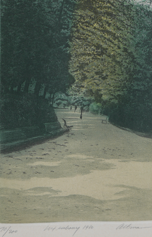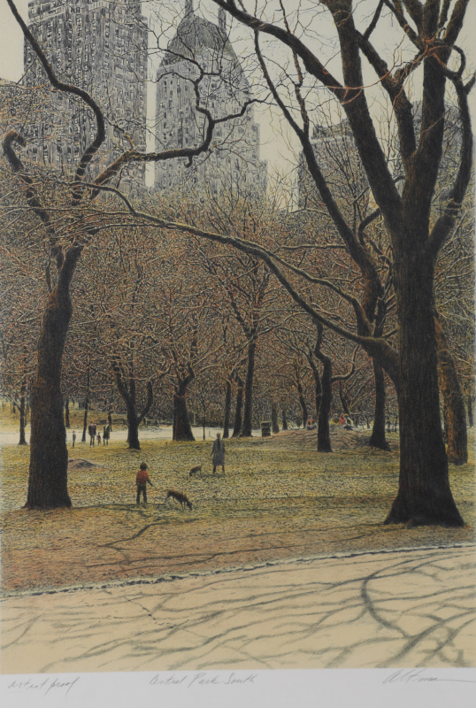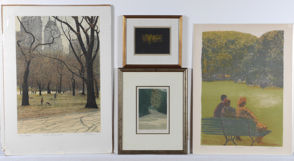 ALTMAN, Harold, (American, 1924-2003): 4 Piece Print lot to Include: 1) Figure Emerging form a Gathering at an Outdoor Cafe, Lithograph, 5 1/8'' x 6.75'', pencil signed lower right, framed, 10.5'' x 12'', signed in the plate and dated 1957, an early work; 2) Luxemborg 1980, Etching, sight size 9.25'' x 6.5'', pencil signed lower right, titled in lower margin and numbered 70/200, framed, 18'' x14'', Merrill Chase Galleries Label affixed verso; 3) ''Bench 2'', Lithograph, 26.5'' x 19.5'', pencil signed lower right, titled in margin and numbered 48/185, enclosed in plastic, unframed; 4) ''Central Park South'', Lithograph, 30'' x 21.5'', pencil signed lower right, titled in margin and marked artist's proof lower left, encased in plastic with cardboard backing, unframed. Altman was a painter, teacher and etcher who spent 4 months each year in Paris where his lithographs were printed at Atelier Desjoberts. He is represented in almost every significant collection in the world as well as in numerous museums and galleries.