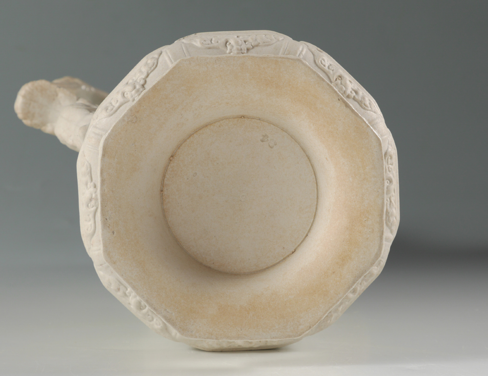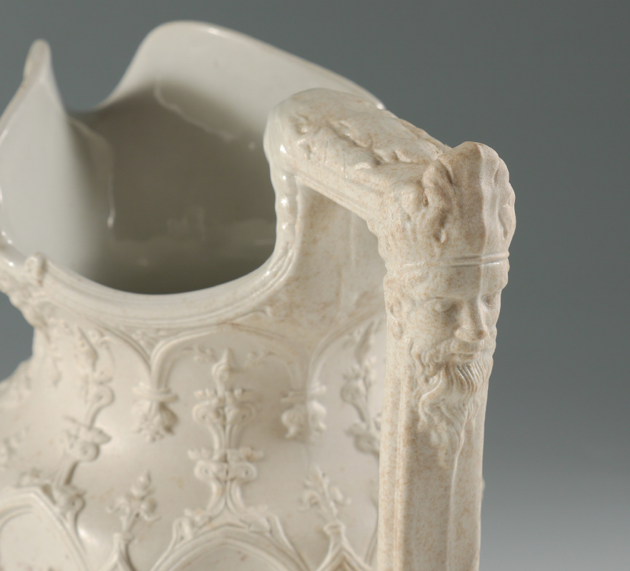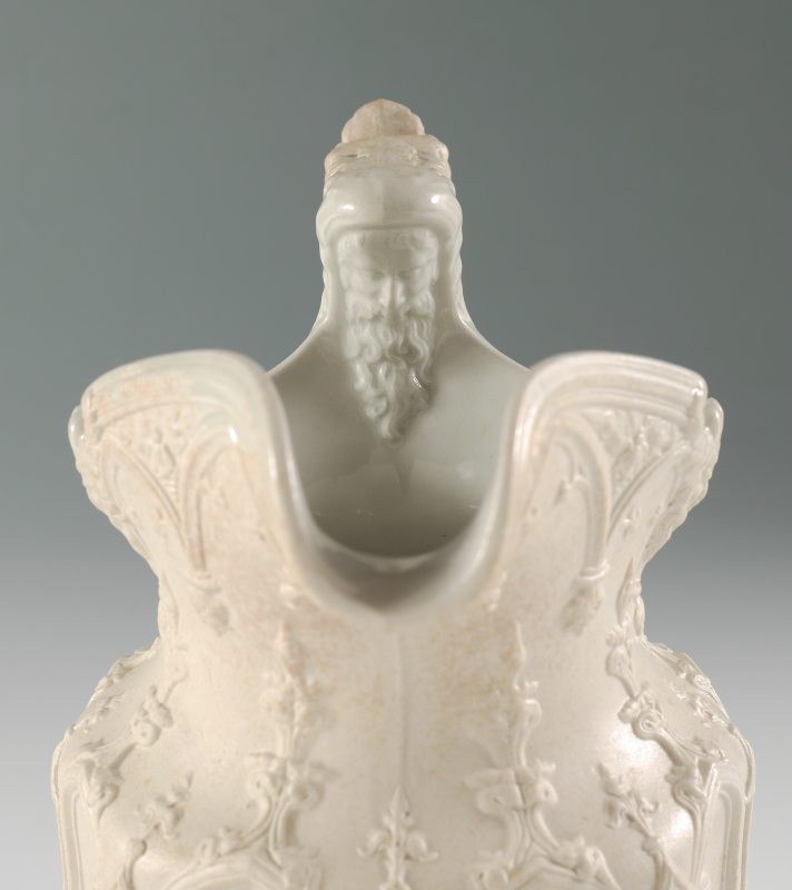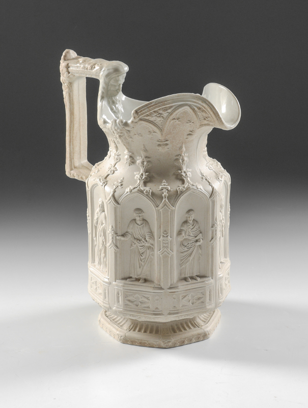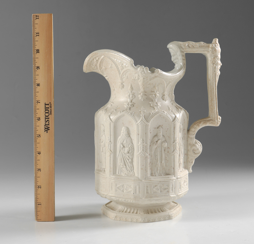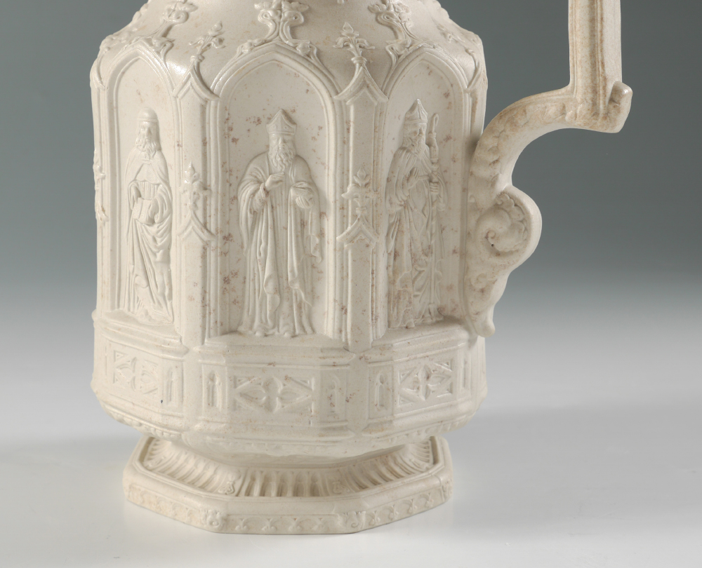 SALT GLAZED APOSTLE PITCHER: Panels of 8 apostles or saints surround body, handle with figural masqueron at body, impressed 34 at base. Overall measures 10 3/4'' h. x 8 1/4'' x 5 1/2''.