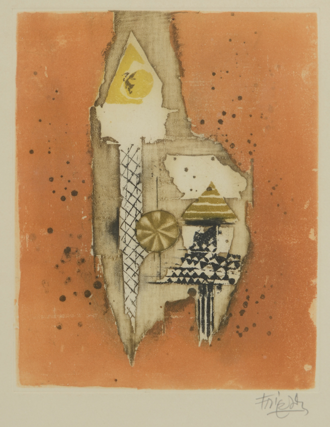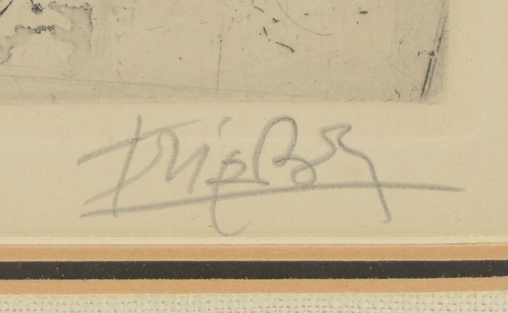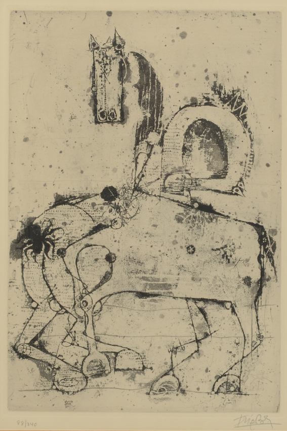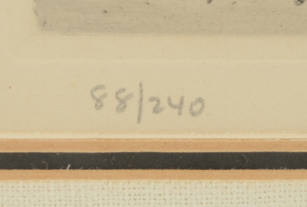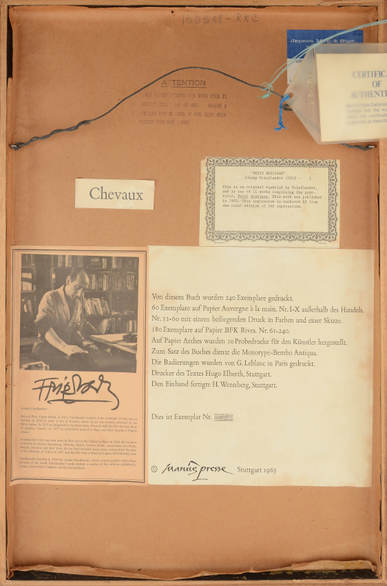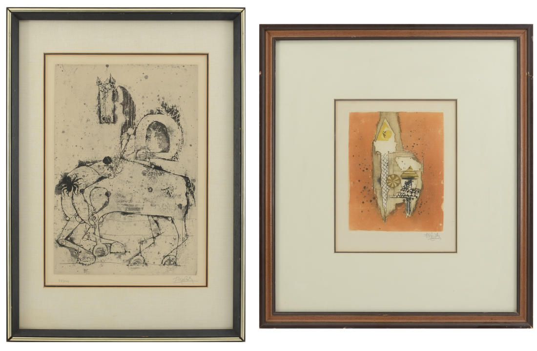 FRIEDLAENDER, Johnny, (Polish, 1912-1992): 1) Abstract composition titled Washington?, Etching, sight size 9.5'' x 7.75'', pencil signed lower right, framed, 19.5'' x 17.5''; 2) ''Chevaux'', from the Portfolio Petit Besteare, Etching, sight size 14.5'' x 10'', pencil signed lower right, numbered 88/240 lower left, Merrill Chase Galleries label affixed verso, period frame, 21'' x 15''. Friedlaender was a pioneer of the technically difficult aquatint etching process. From his atelier in Paris he instructed other artists who went on to become noteworthy and became experts in lithographic and etchings art, including Piza, Coudrain, Carcan and Boulanger.