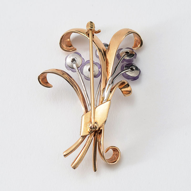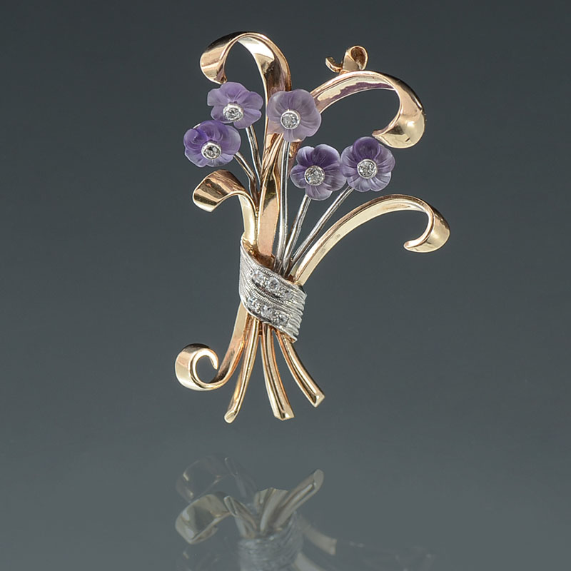 14K ART DECO DIAMOND & CARVED AMETHYST FLORAL PIN: Flowers are set on white gold stems accented with yellow gold leaves all wrapped in diamonds. Pin measures 2'' high and 1'' wide.