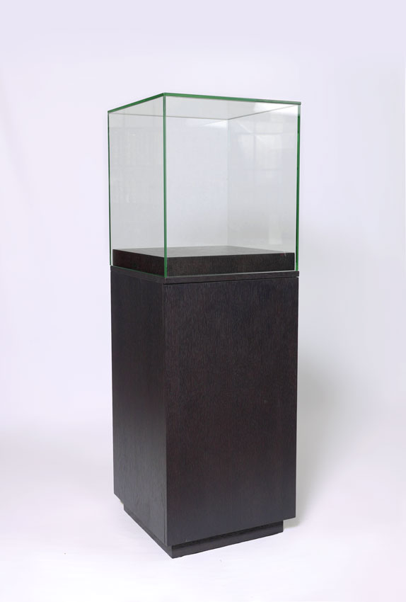 GLASS AND WOOD DISPLAY CASE: Black painted wood base with single door, single interior shelf, glass cube top. Base measures 31 3/4'' h. x 15 3/4'' square, inside platform 14 3/4'' square. Glass cube measures 17 3/4'' h. x 15 3/4'' square.