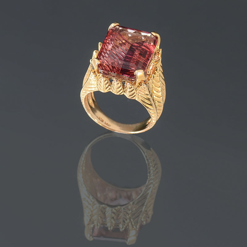 PRETTY IN PINK 14K TOPAZ RING: 14K yellow gold ring contains one emerald fantasy cut pink topaz. Weight: 10.00 Ct Approx. The topaz is prong set. Mounting weight: 10.1 grams approx. Size: 7