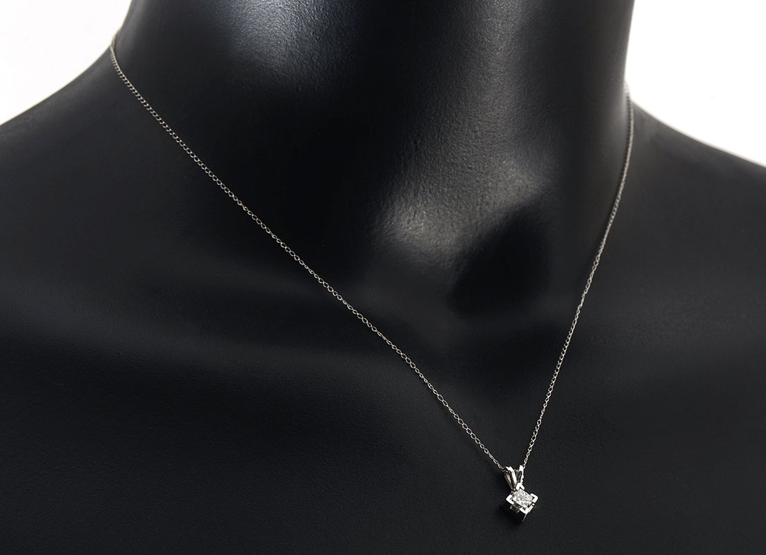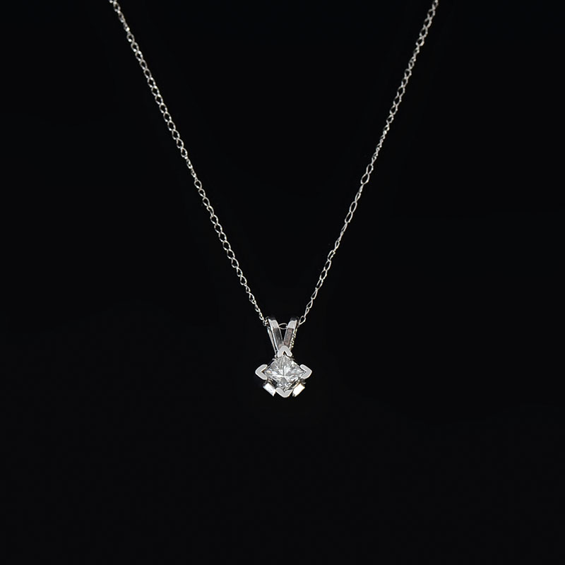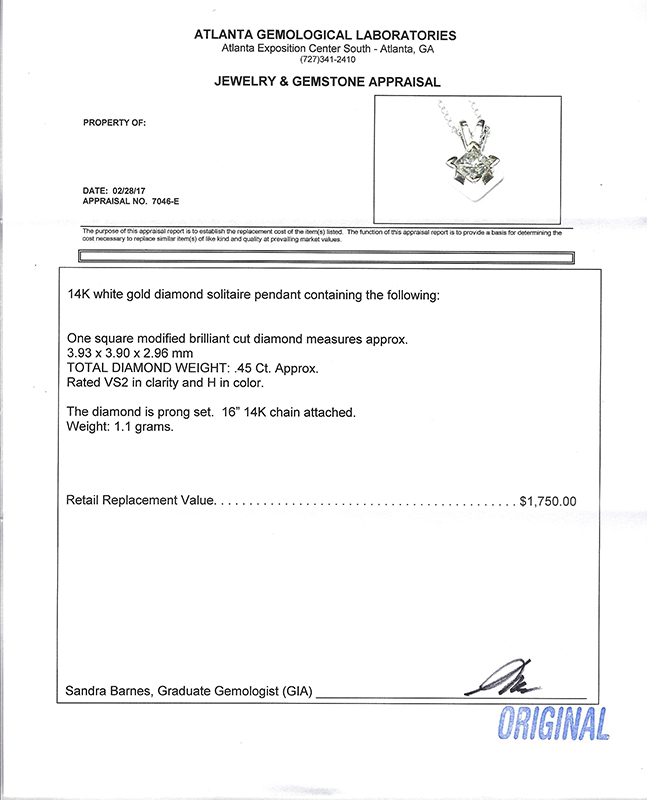 14K PRINCESS CUT DIAMOND SOLITAIRE PENDANT: White gold diamond is .45CT approx and is rated VS2 in clarity and H in color. comes with 16'' 14K chain. Weight 1.1 grams. Sold with current Atlanta Gemological GIA graduate's appraisal for $1750.