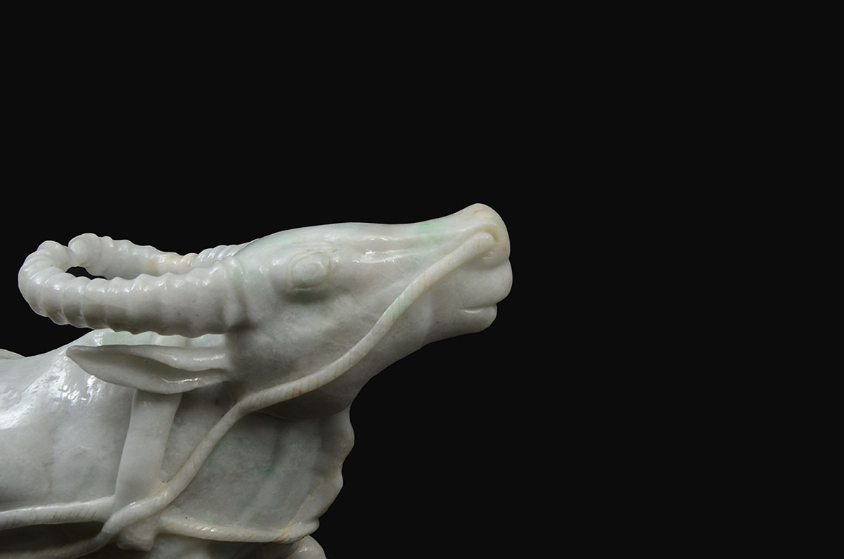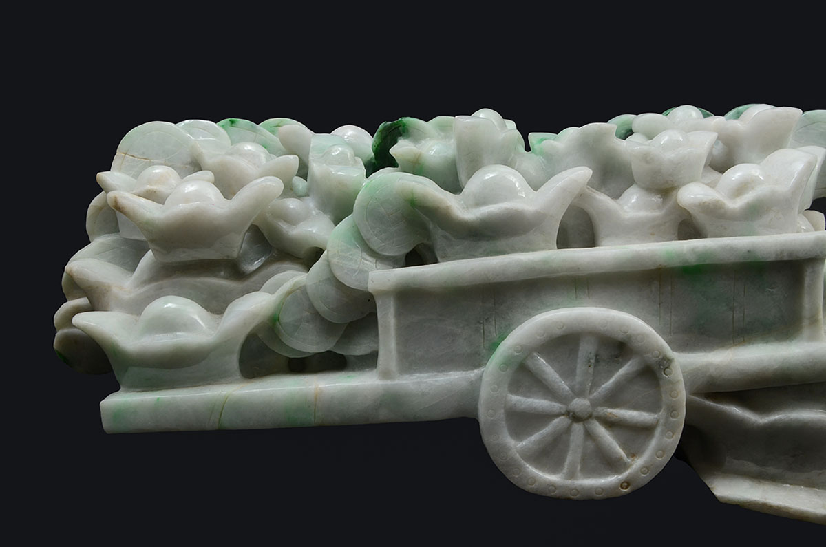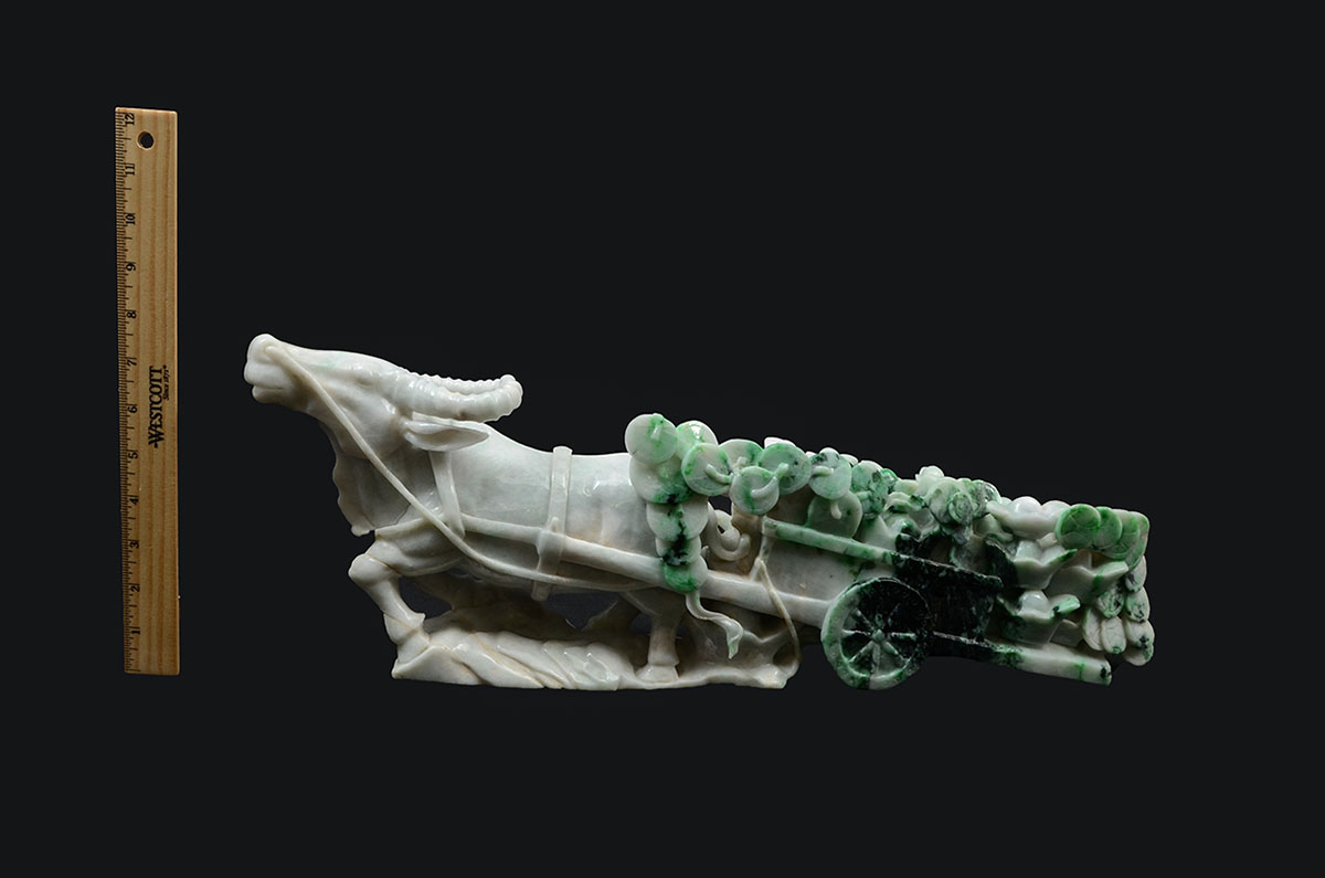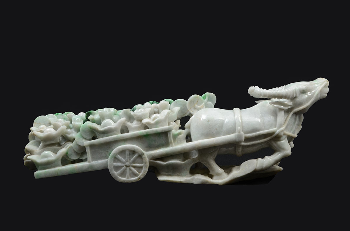 LARGE CHINESE CARVED JADEITE OX CART: Carved apple green and white jadeite or similar stone figure of a ox pulling a cart filled with censers and coins, measures 8'' h. x 23'' x 3 1/2''.