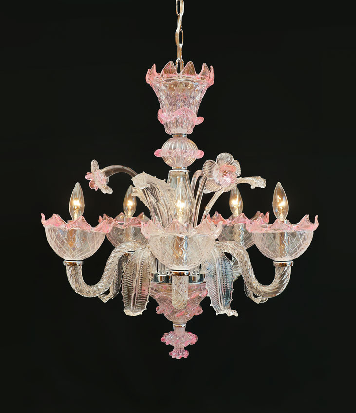 VENETIAN STYLE GLASS CHANDELIER: Contemporary chandelier, 5 arms, floriform bobeche with pink petal accents, shaped leaf and flower decoration, chrome body. Overall measures 27 1/4'' h. x 22'' dia.