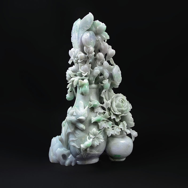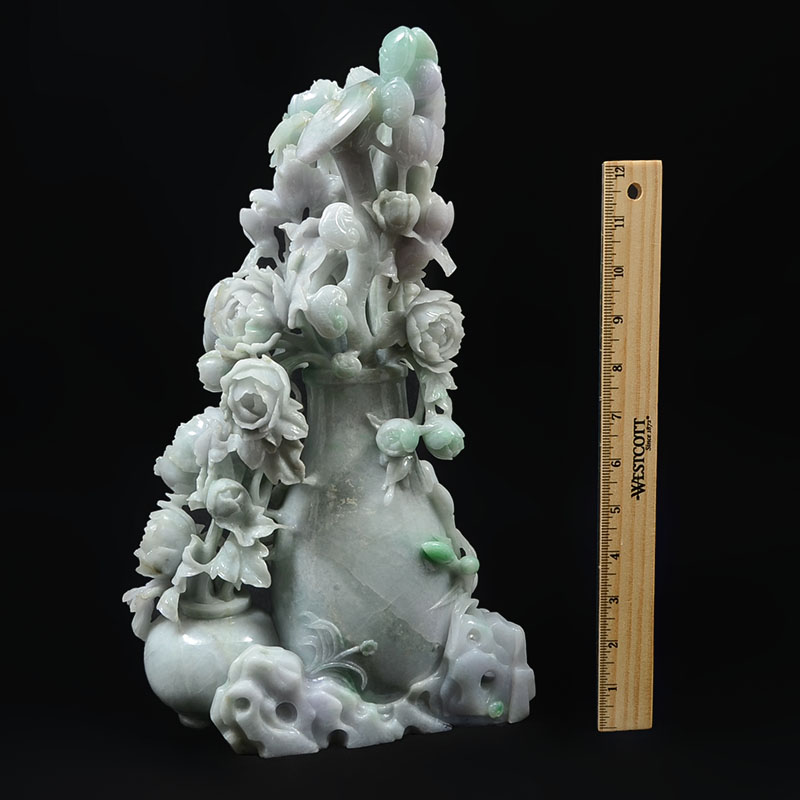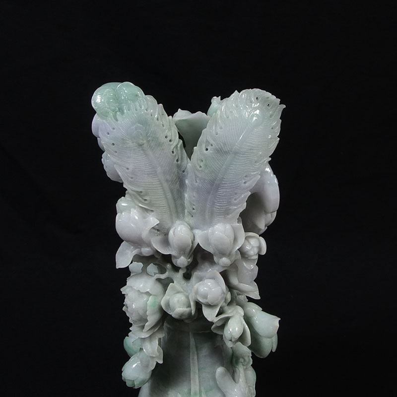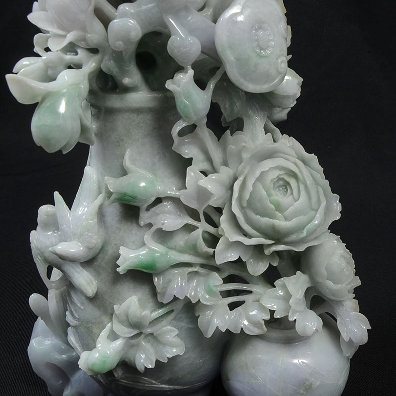 LARGE CHINESE CARVED JADEITE VASE WITH FLOWERS GROUP: Apple green, white and hints of light lavender jadeite or similar stone grouping of a flower vases with blooms, feathers, and birds, overall 14 3/4'' h. x 8 3/4'' x 4 1/2''.
