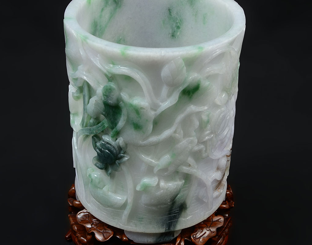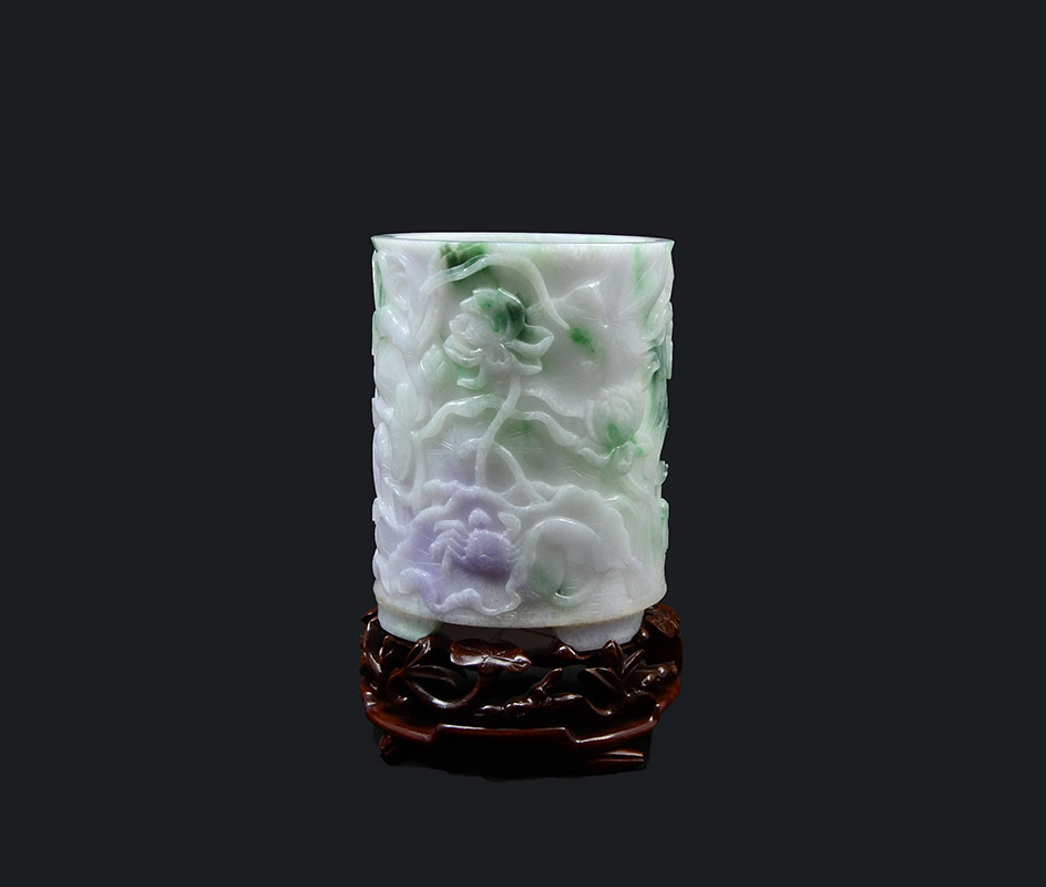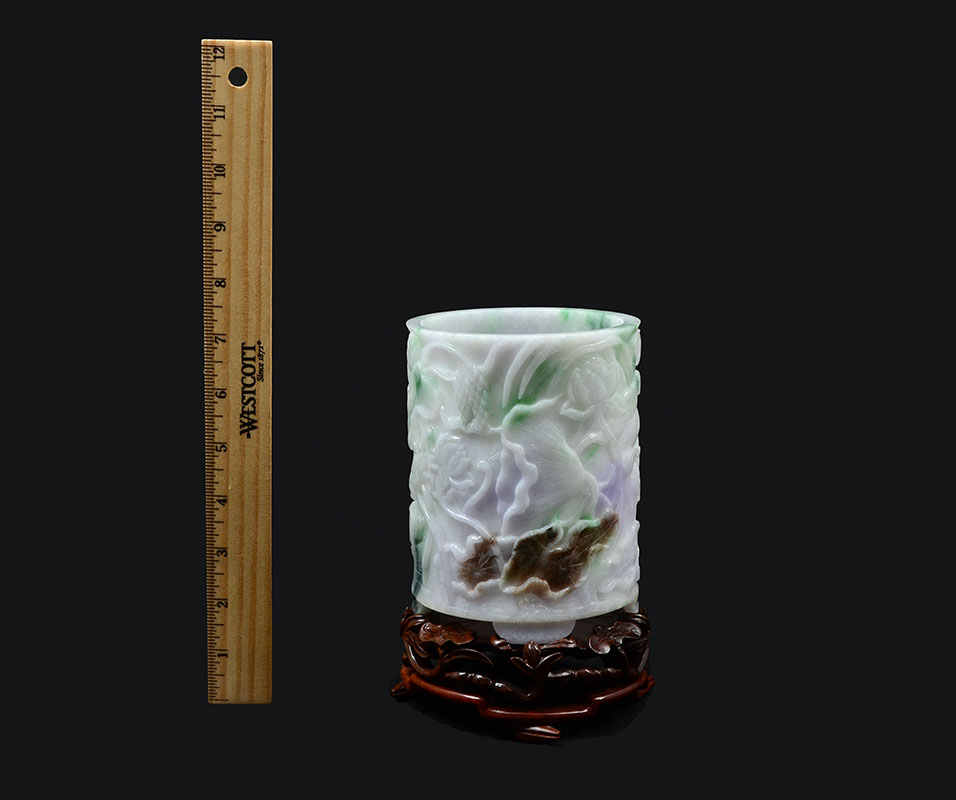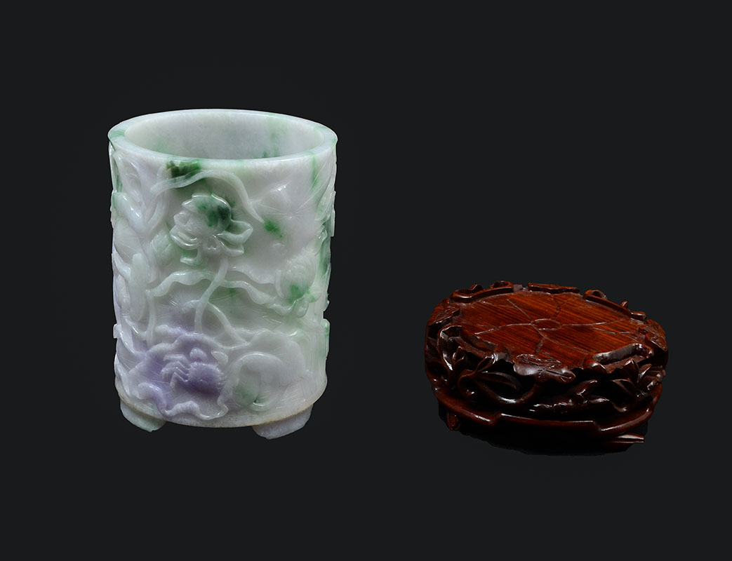 CHINESE CARVED JADEITE BRUSH POT: Lavender, apple green and white jadeite or similar stone brush pot with carved water lilies and crab, measures 5 1/2'' h. x 4 1/2''. Fitted carved base 2'' h. x 5''