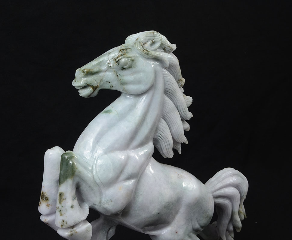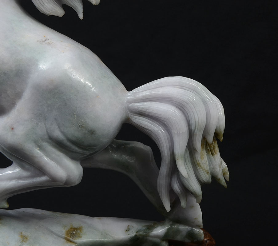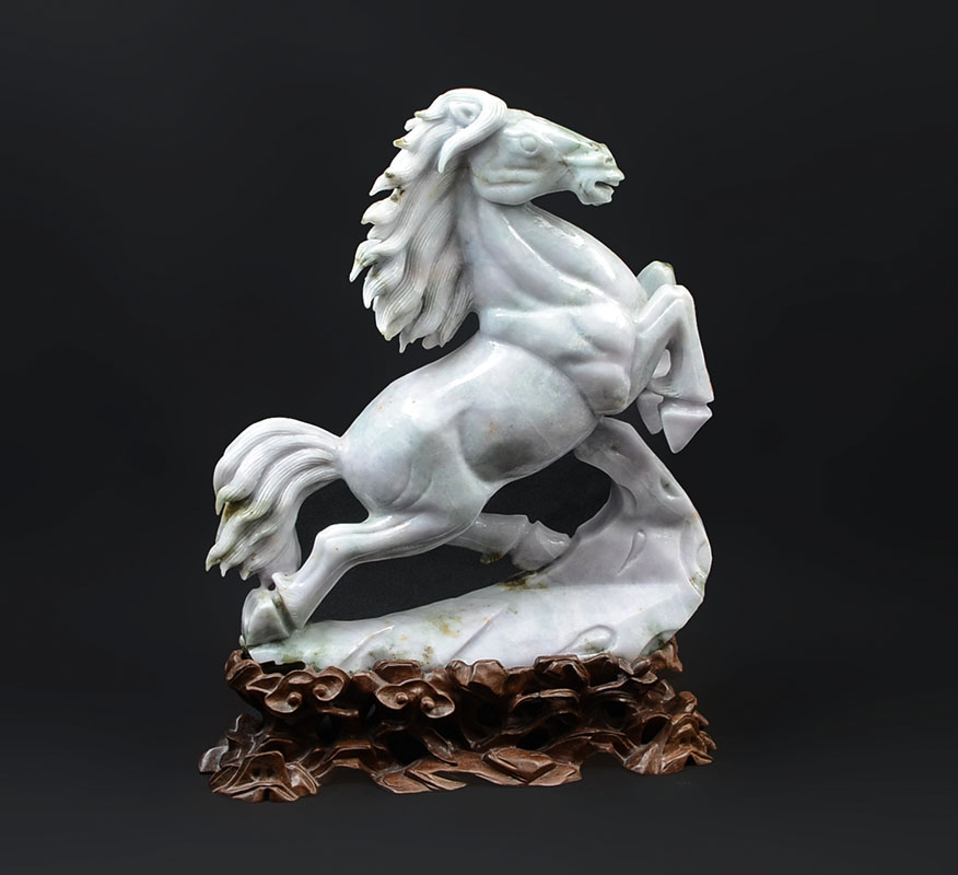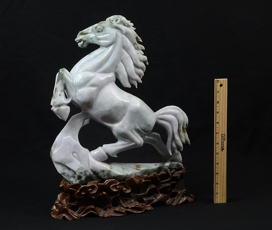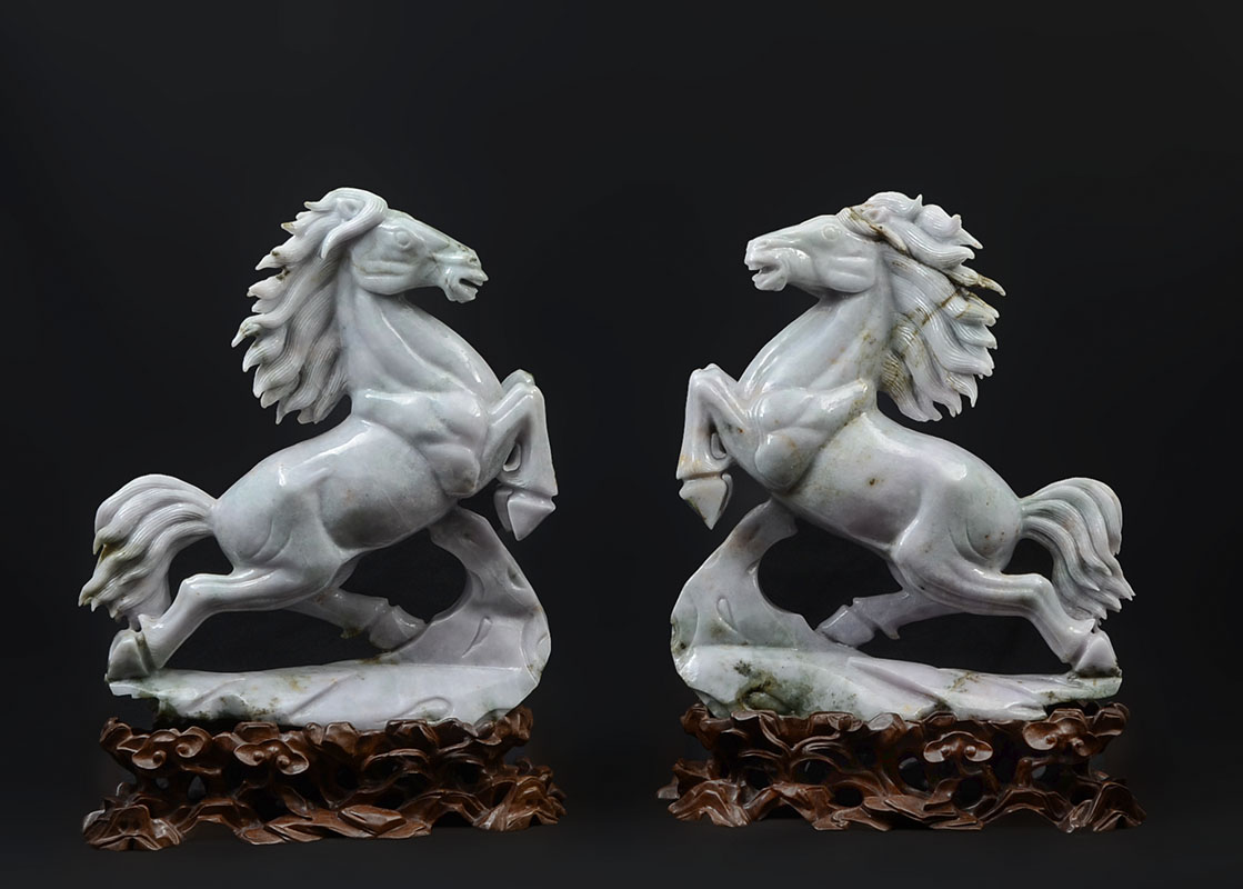 PAIR CHINESE CARVED JADEITE REARING HORSES: Apple green and light lavender jadeite or similar stone mirror image pair of figural horses rearing up. Each horse measures 15 3/4'' h. x 14'' x 4'', carved wood base 3 1/4'' h. x 14 1/4'' x 5 3/4''.