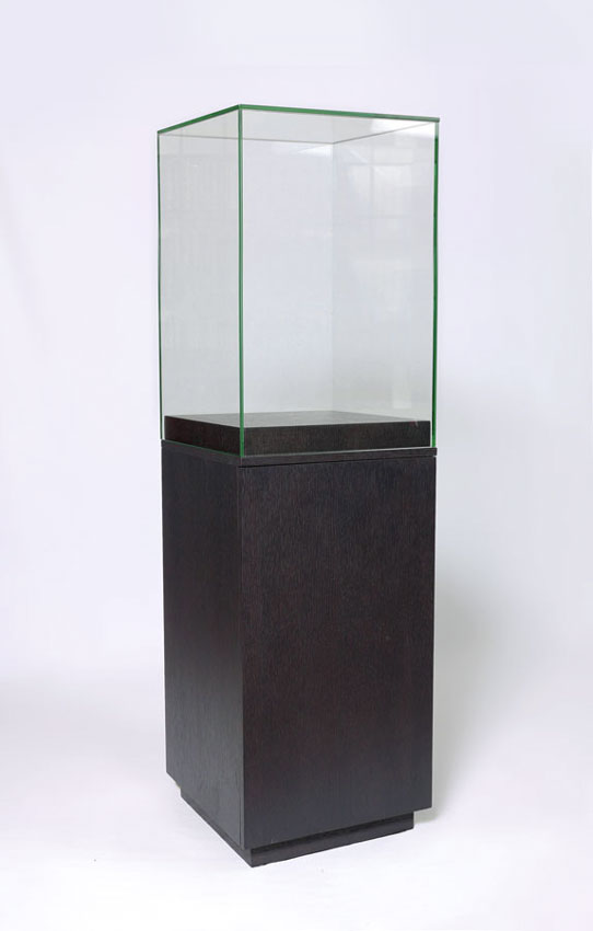 GLASS AND WOOD DISPLAY CASE: Black painted wood base with single door, single interior shelf, glass cube top. Base measures 31 3/4'' h. x 15 3/4'' square, inside platform 14 3/4'' square. Glass cube measures 23 3/4'' h. x 15 3/4'' square.