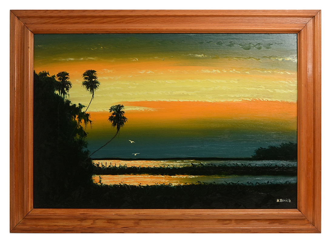 DANIELS, Willie, (American, 20th Century): Stunningly vibrant Florida Highwaymen sunset over the Indian River scene, Oil/Upson, signed lower right, 24'' x 36'', framed 30 3/4'' x 42 1/4''.