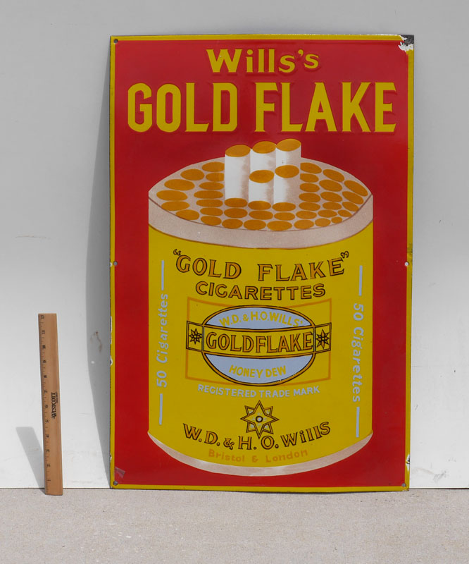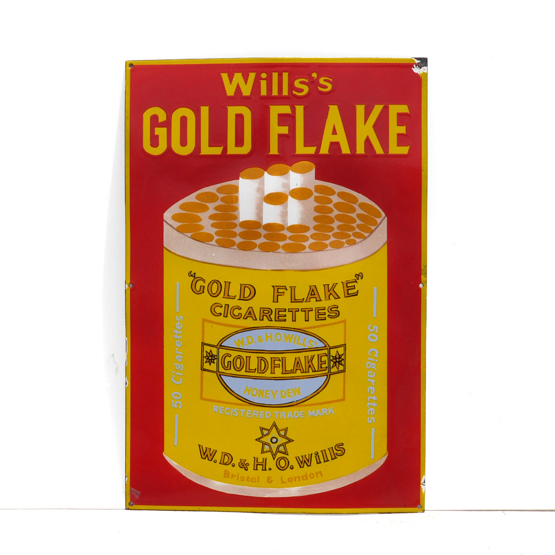 WILL'S GOLD FLAKE CIGARETTES ADVERTISING SIGN: Porcelain sign with Will's Gold Flake and image of a pack of cigarettes, measures 30 1/4'' h. x 20''.
