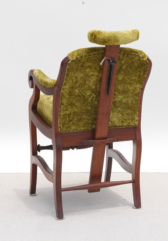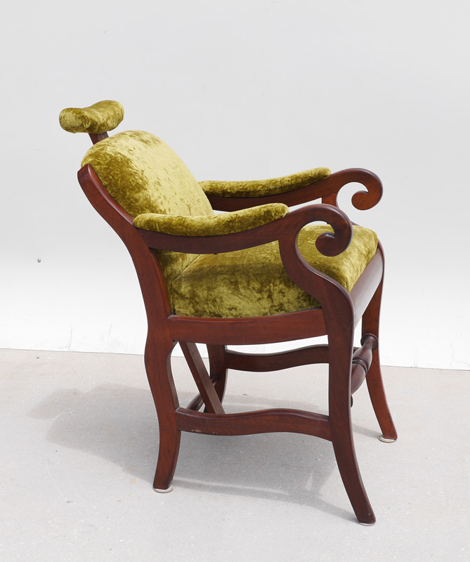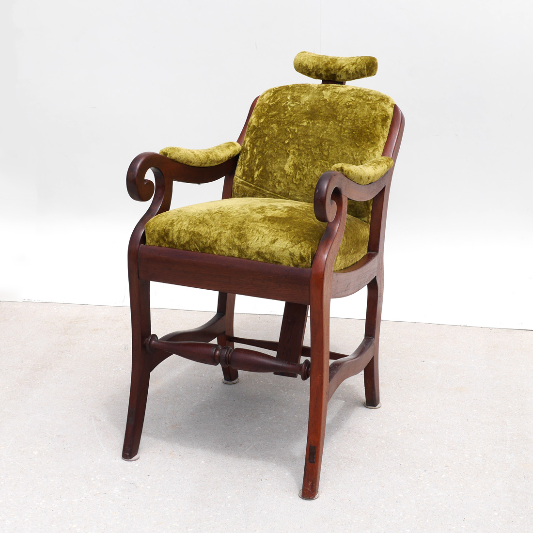 ANTIQUE EMPIRE WOOD GREEN VELVET BARBER CHAIR: Circa 1890, shaped stationary wood frame with adjustable head rest, green velvet upholstery, overall measures 42 1/4'' h. x 23'' x 35''.