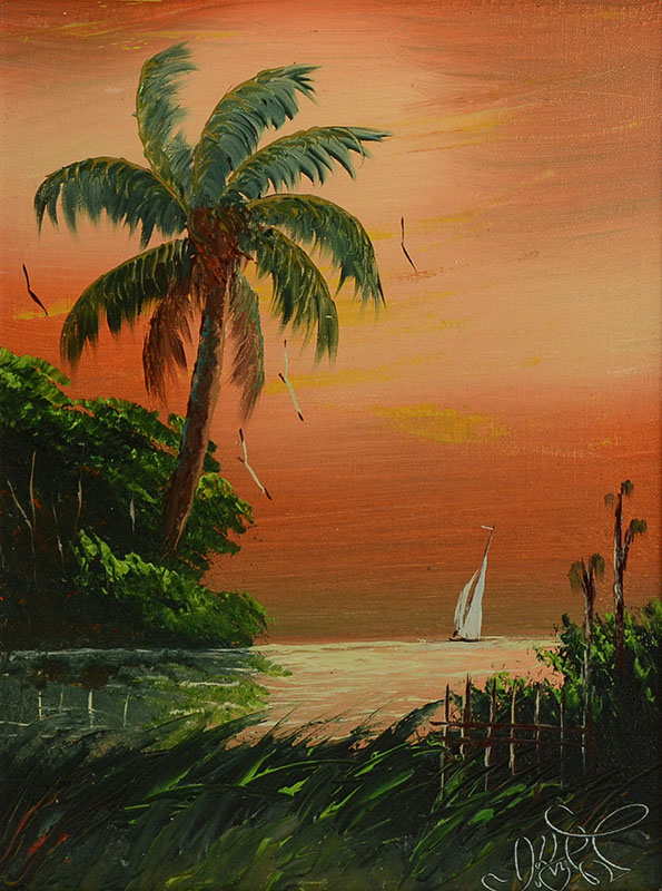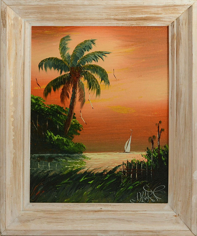 KNIGHT, Isaac, (American, 20th Century): Florida Highwaymen sunset over the Indian River with a sailboat and birds, Oil/Board, 16'' x 12'', signed lower right, framed 18 1/4'' x 15 1/4''.