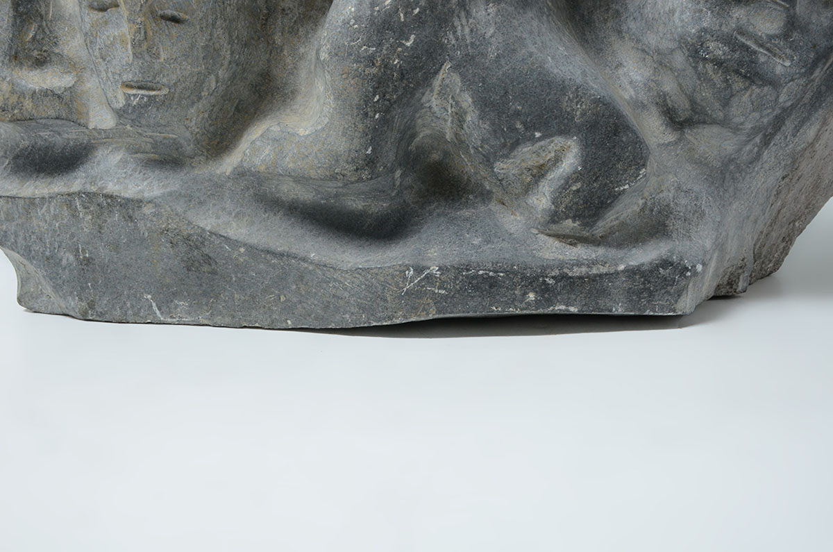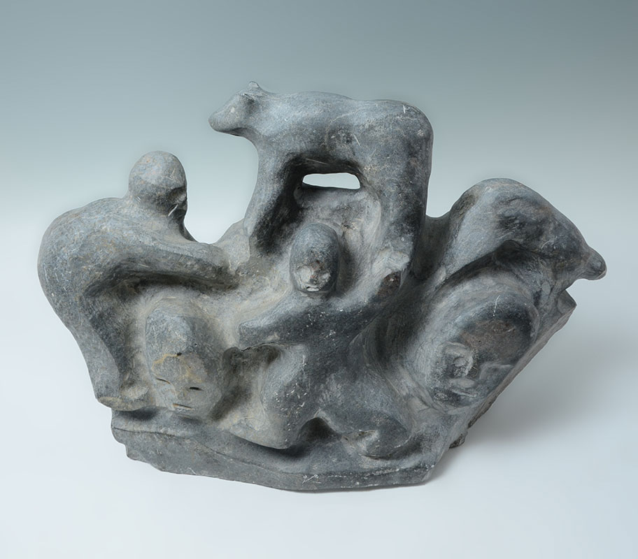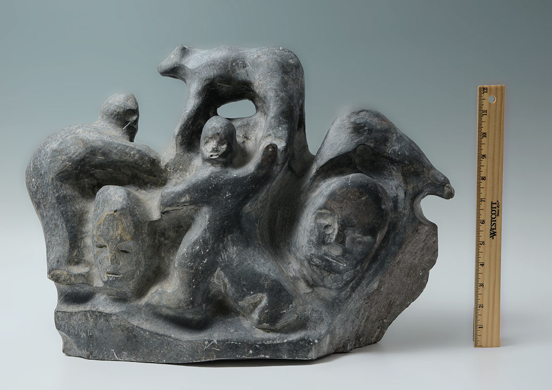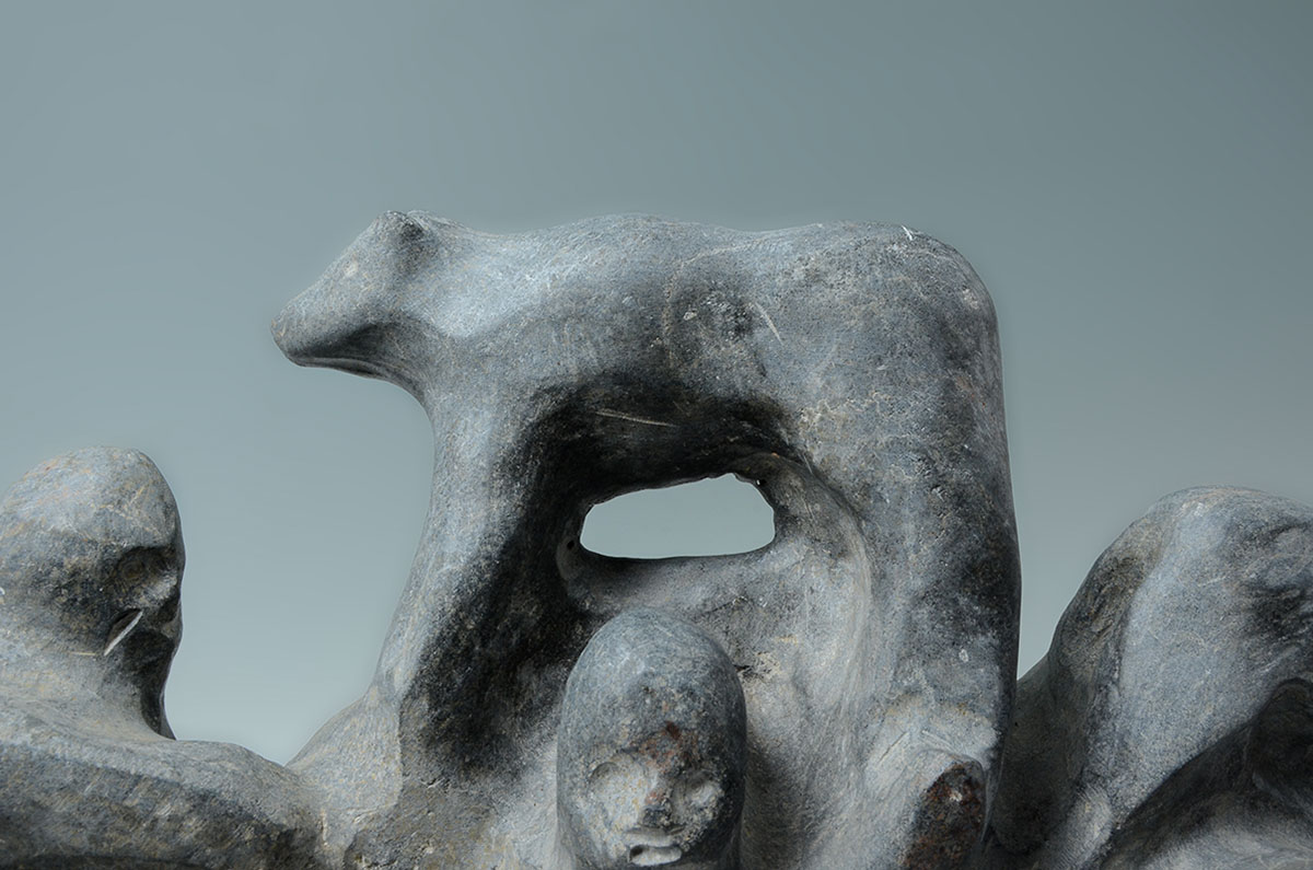 INUIT CARVED STONE FIGURAL GROUP: Heavy carved stone sculpture, stylized human figures with bears, relief carved faces, no visible signature. Overall measures 15 1/4'' h. x 20 1/2'' x 6 1/2''
