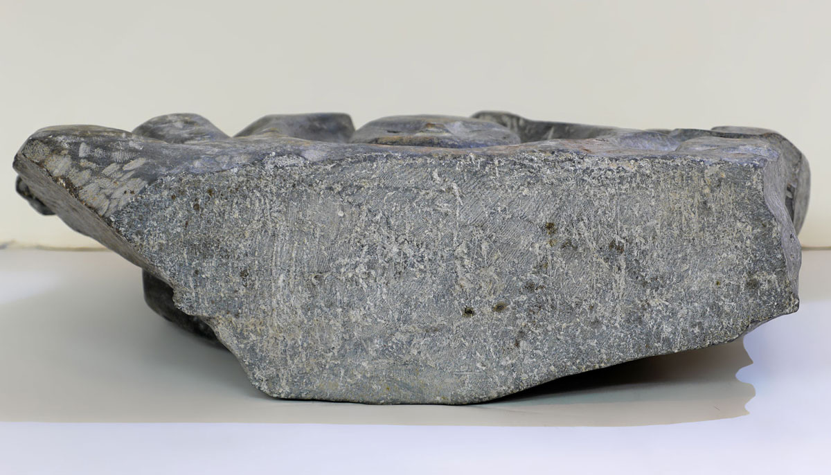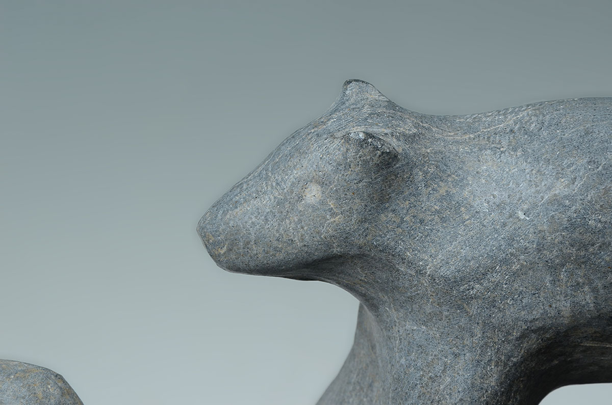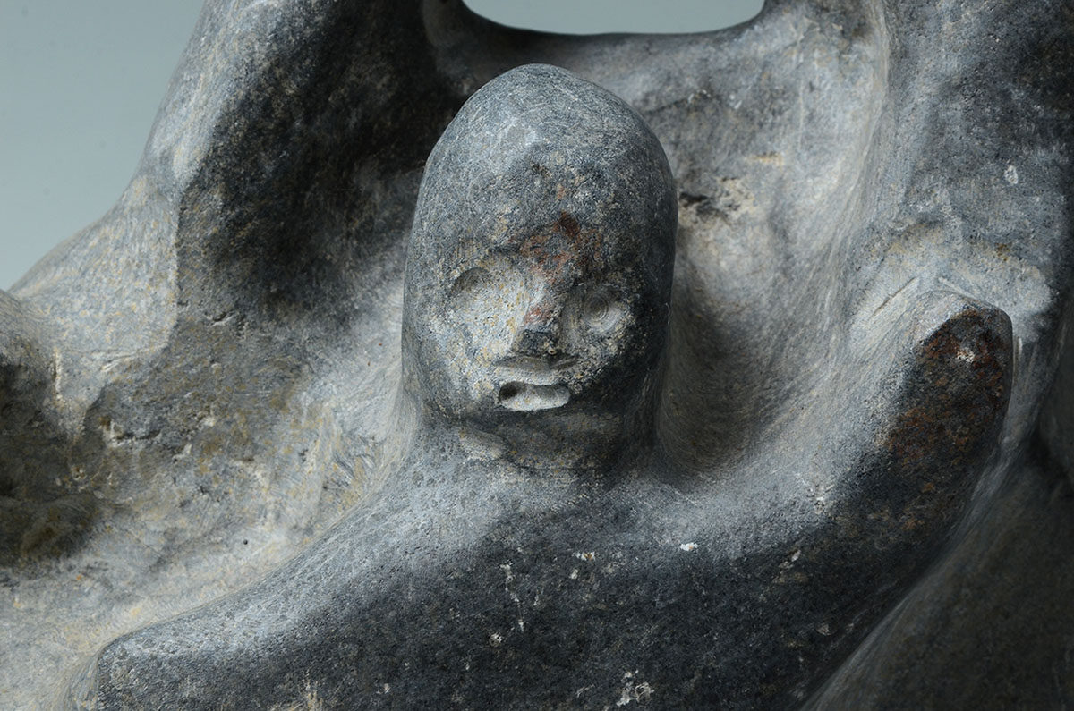INUIT CARVED STONE FIGURAL GROUP: Heavy carved stone sculpture, stylized human figures with bears, relief carved faces, no visible signature. Overall measures 15 1/4'' h. x 20 1/2'' x 6 1/2''