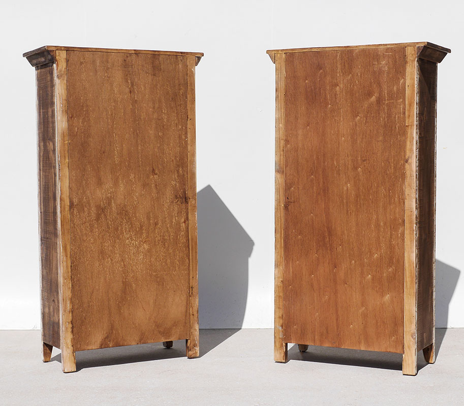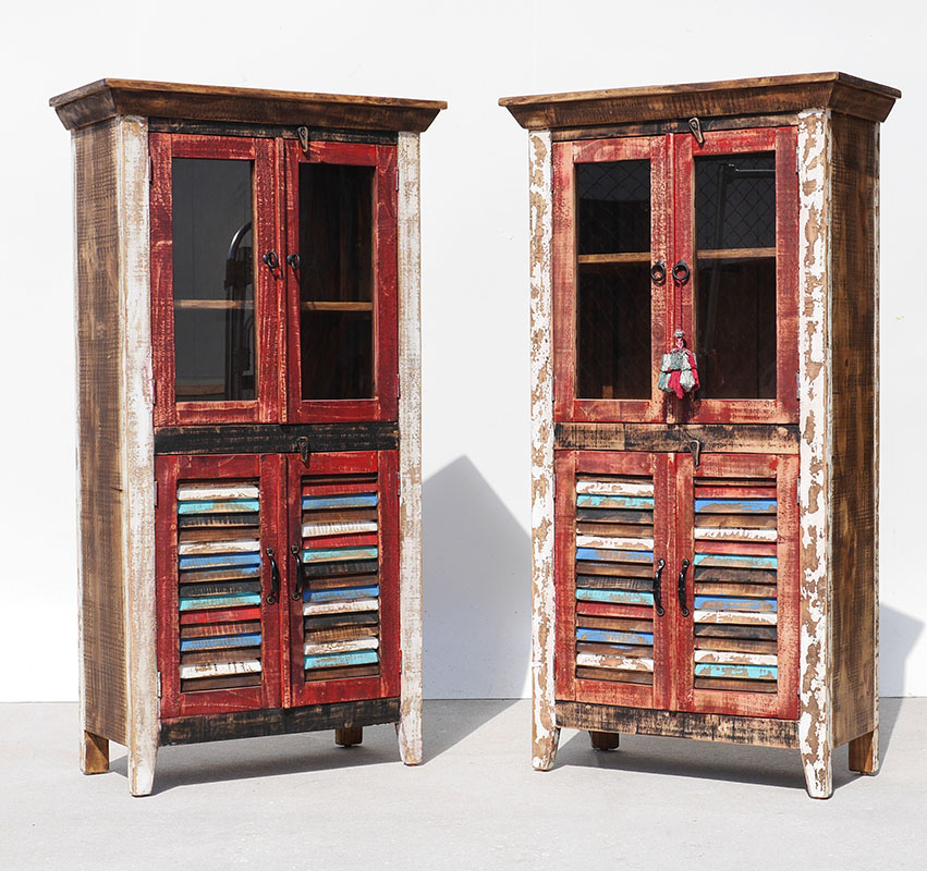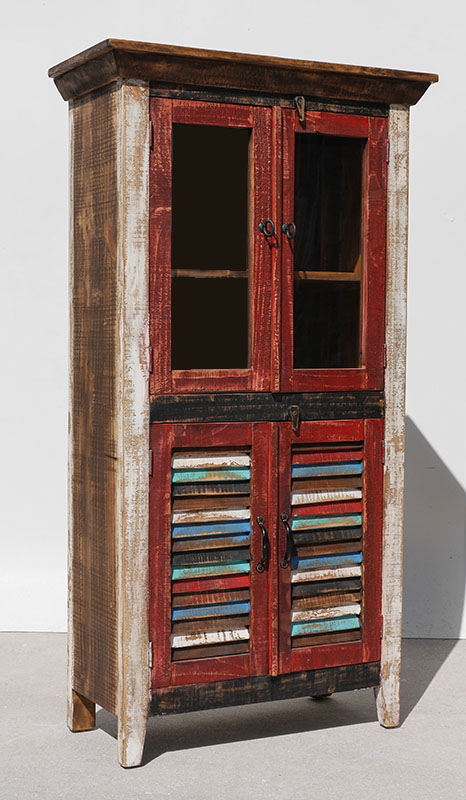 2 SOUTHWESTERN RUSTIC STYLE WOODEN CABINETS: Rustic flaking paint decorated exterior, 2 glass doors over 2 louvered doors, measures 60 1/2'' h. x 32'' x 14 3/4''.