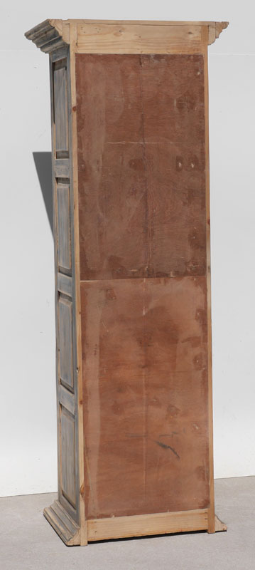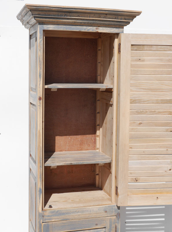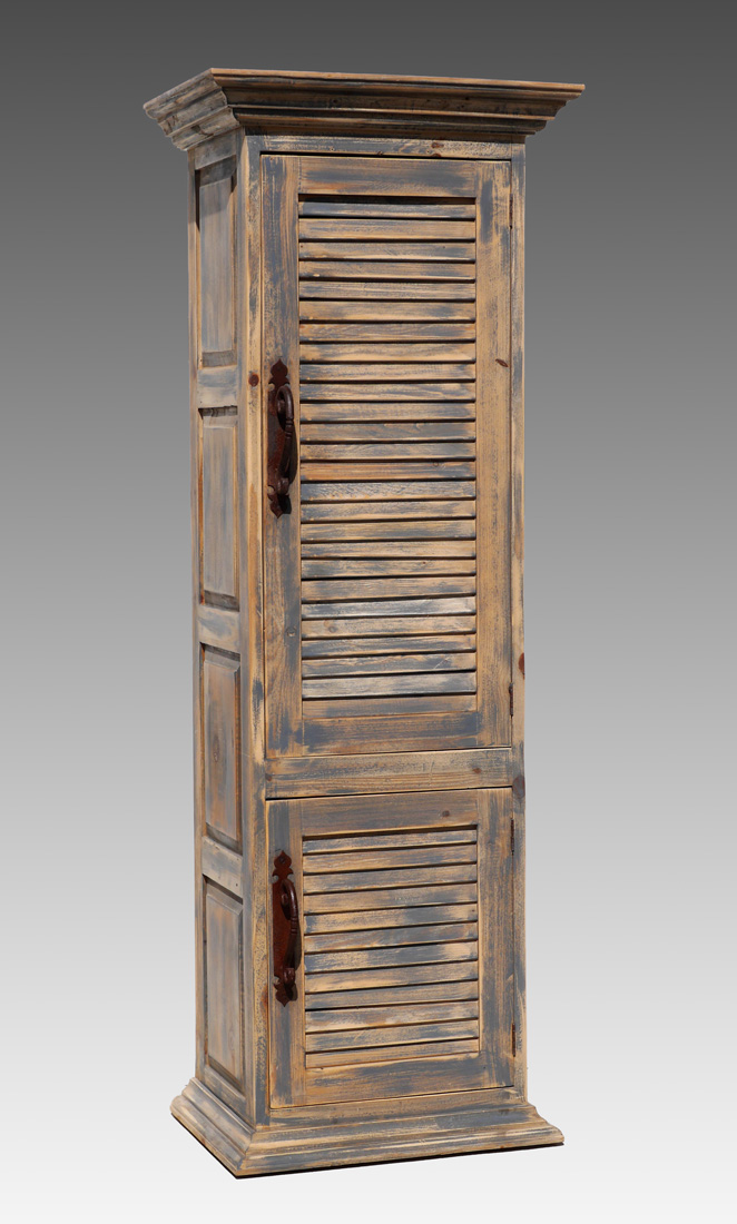 TALL RUSTIC WOODEN LOUVERED CABINET: Rustic paint decorated with 2 over / under louvered doors, overall measures 85 1/2'' h. x 30'' x 21 1/4''.