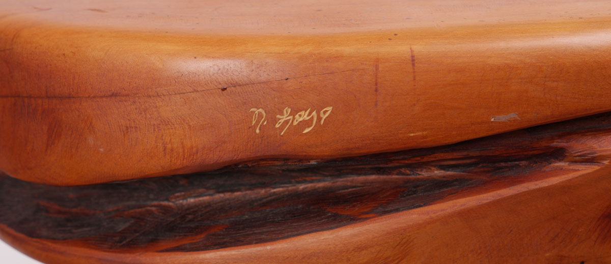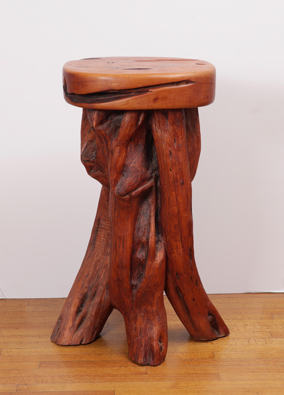 N. LOYA? CARVED ROOT PEDESTAL STAND: Large pedestal / stand from carved root wood, possibly teak, signed N. Loya?, overall measures 41 1/2'' h. x 28'' x 24''.