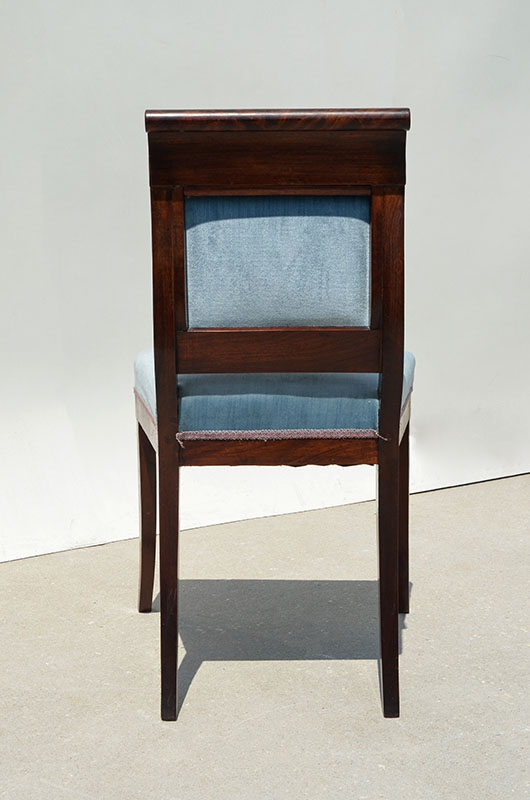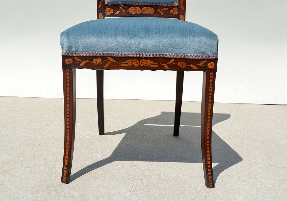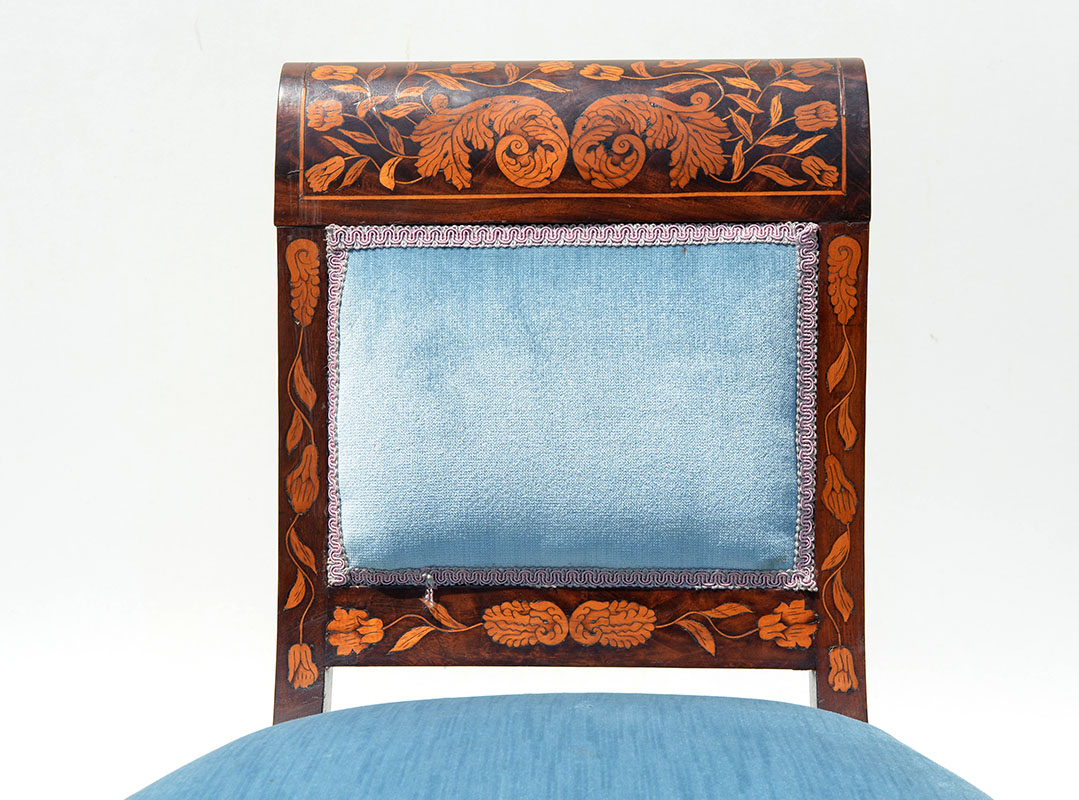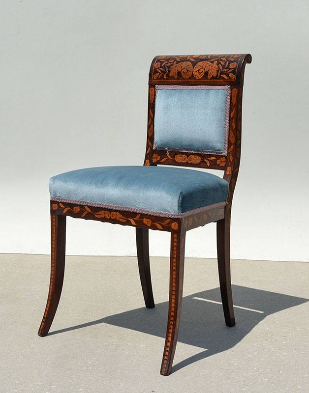 DUTCH FLORAL MARQUETRY INLAID SIDE CHAIR: Shaped back, floral inlaid marquetry decoration, blue velvet upholstery, 35'' h. x 19 1/2'' x 16 3/4''.