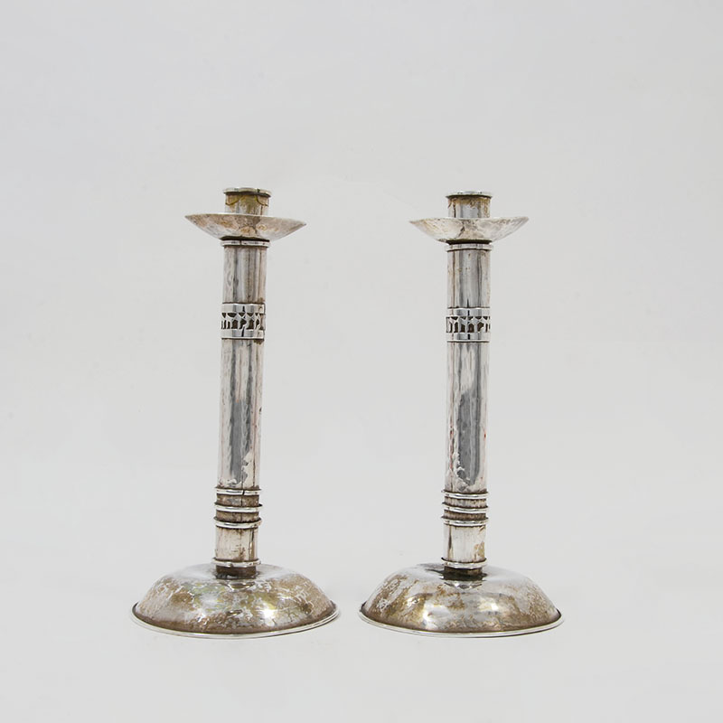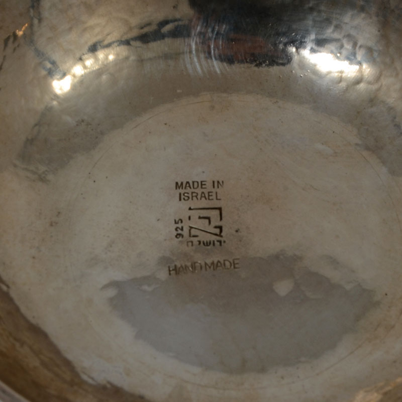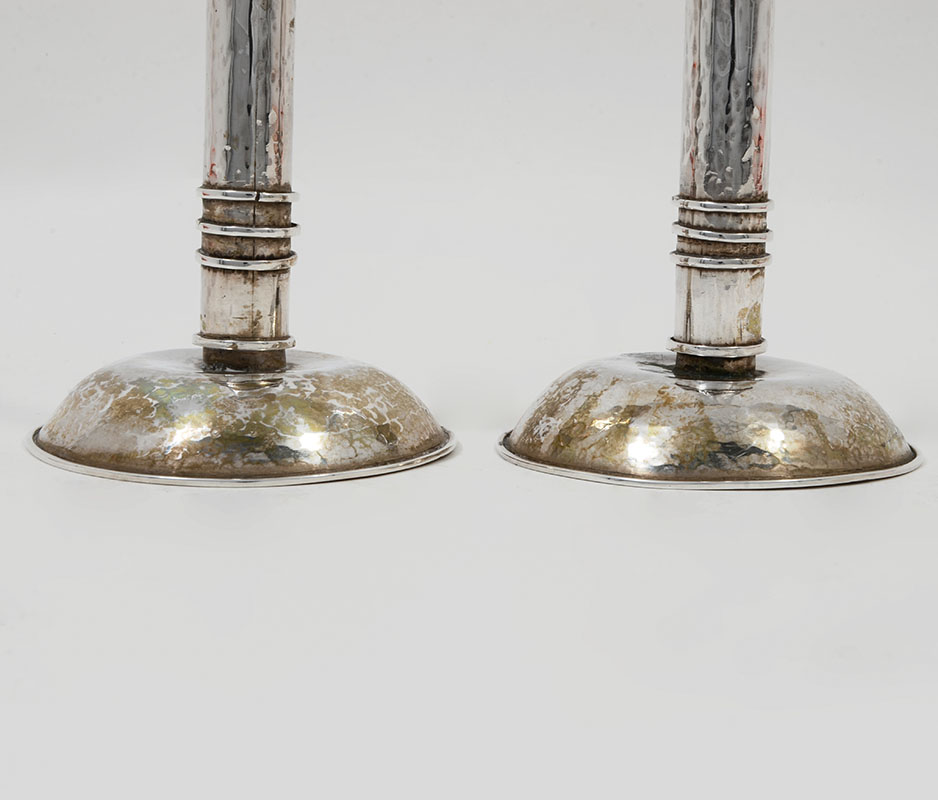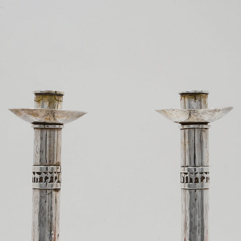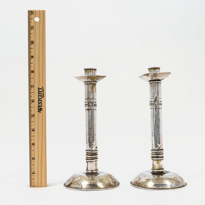 PAIR HANDMADE SILVER ISRAELI CANDLESTICKS: Hand hammered with ring on column with Hebrew writing. Marked on base Made in Israel, 925, unknow makers mark, and Handmade. 8 1/4'' h. x 4'', approx. 14.2 troy oz.