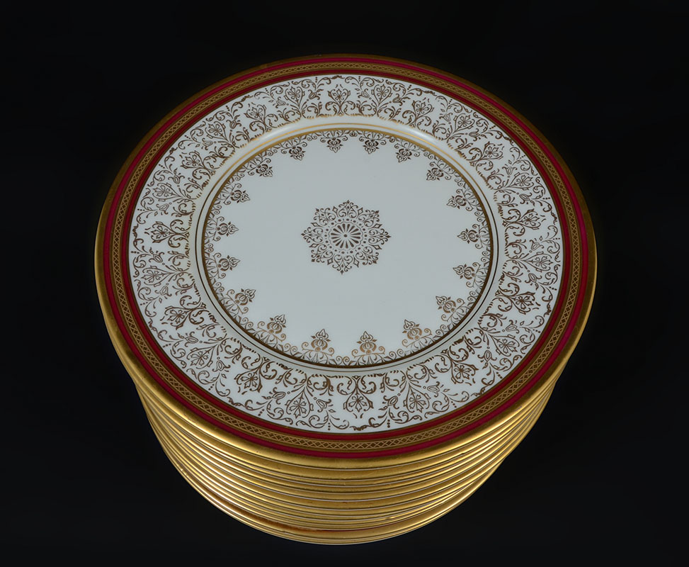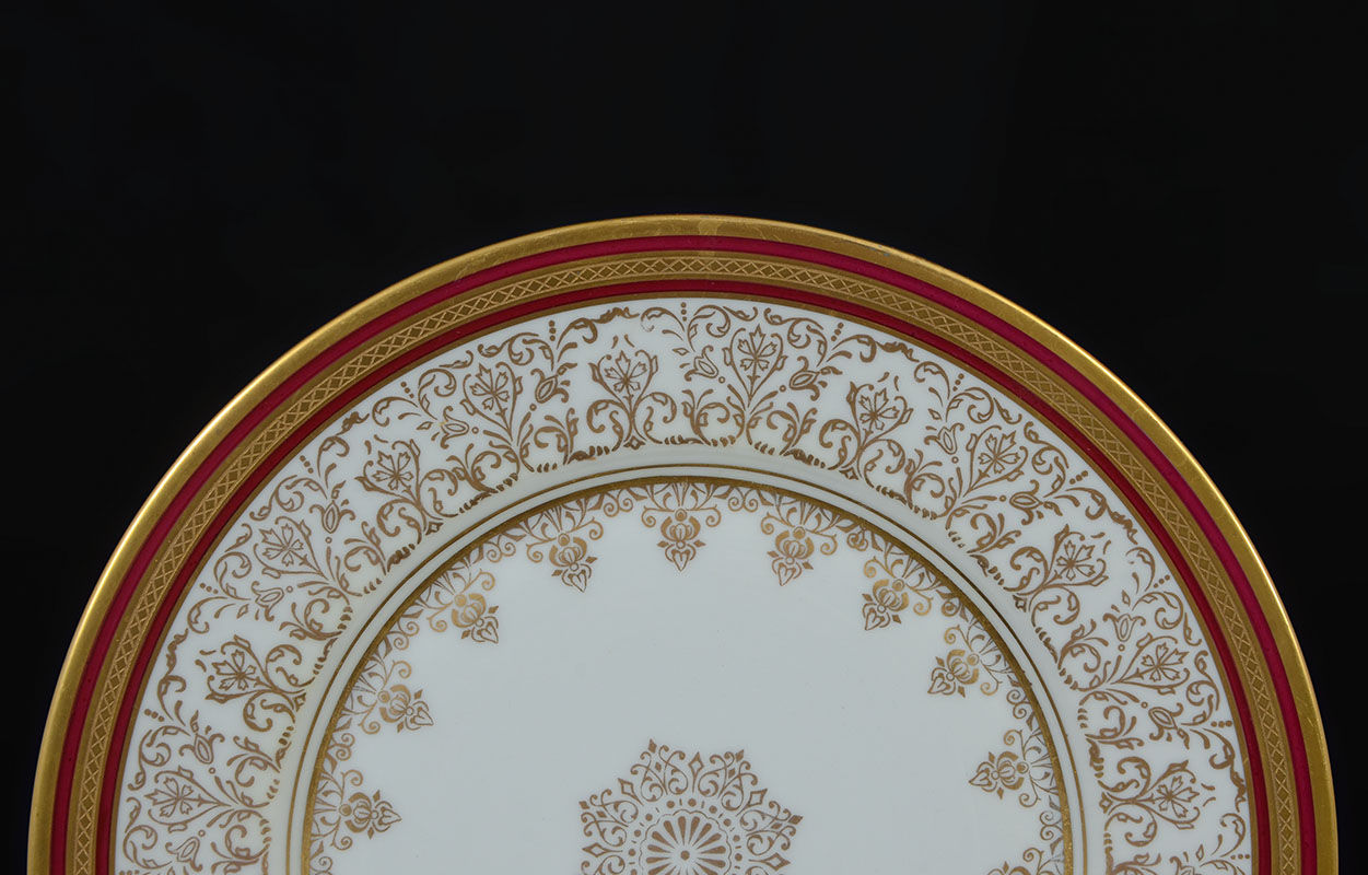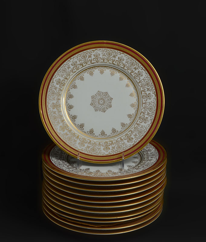 12 MAIER & CO. FOR OVINGTONS DINNER PLATES: 12 dinner plates from J. S. Maier & Co., Czechoslovakia, for Ovingtons New York, gilt filigree and red banded rim, 10 3/4'' dia.