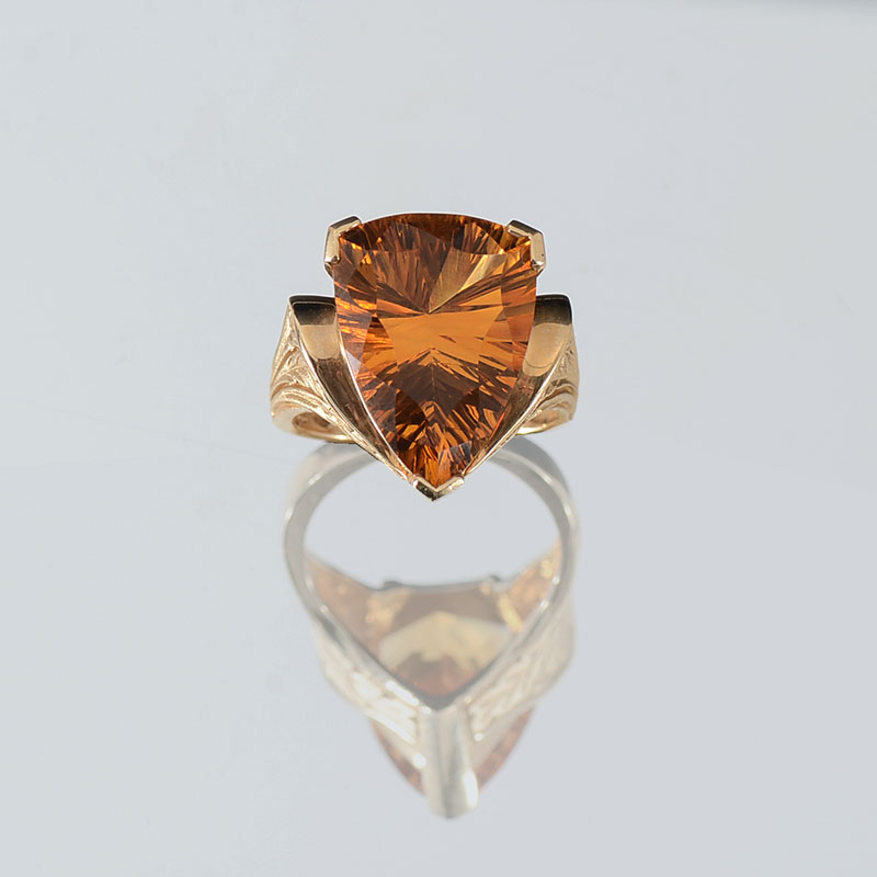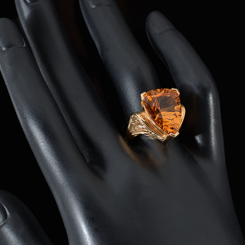 14K 10CT CITRINE RING: 14K yellow gold ring contains one triangle fantasy cut citrine. Weight: 10.00 Ct Approx. The citrine is prong set. Mounting weight: 8.6 grams approx. Size: 7