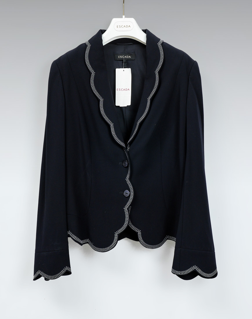 CLASSIC BLACK ESCADA TULIP SLEEVE JACKET WITH WHITE STITCHING: Beautifully styled and fully lined 2 button jacket. US size 10 / European size 42. Excellent condition with tag still on it.