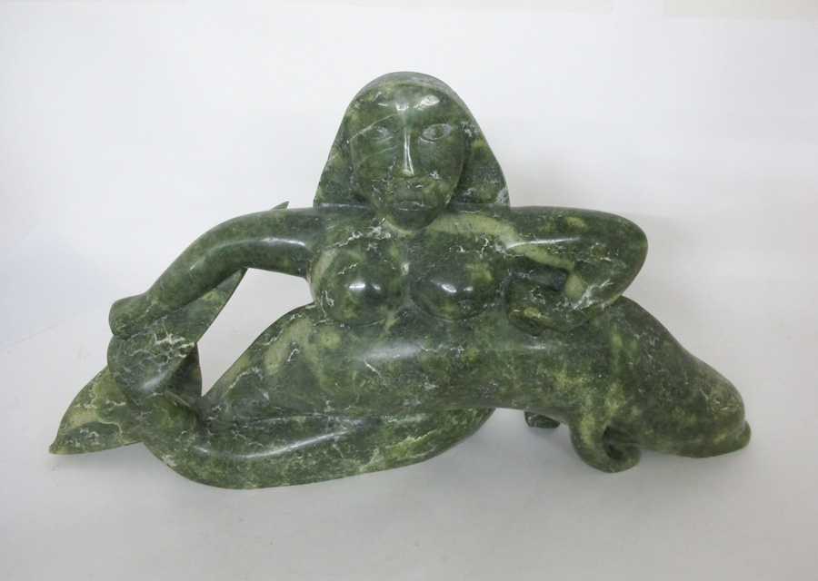 INUIT LARGE CARVED STONE SEDNA & SEAL: Large carved stone figure of the Inuit goddess Sedna as a mermaid holding a seal. Overall measures 15 1/2'' h. x 29'' x 8 3/4''.