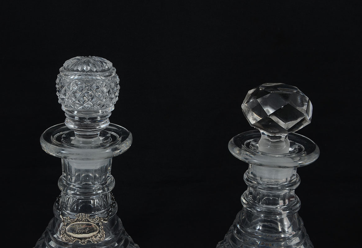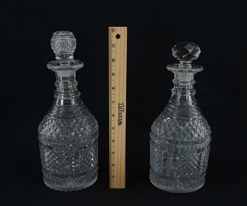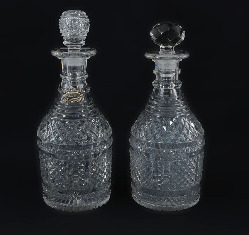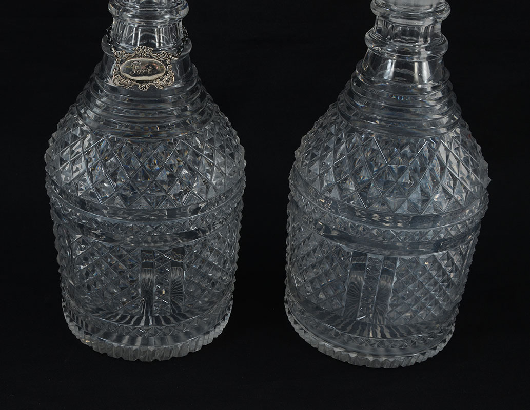 PAIR ANGLO-IRISH REGENCY CUT GLASS DECANTERS: Matched pair with the exception of the stoppers, unmarked, one with Port tag. 11 3/4'' h. x 4 1/2''.