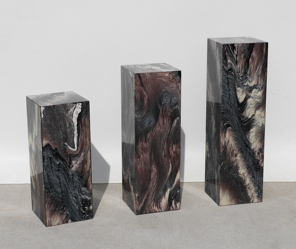 SET OF 3 GRADUATED STONE PEDESTALS: A graduated set of 3 polished solid striated stone or marble pedestals, fiberglass mesh interior for support. Tallest measures 41 1/2'' h. x 12'' x 12'', middle 35 3/4'' h., lowest 29 3/4'' h.