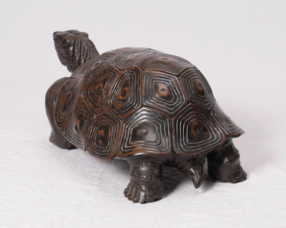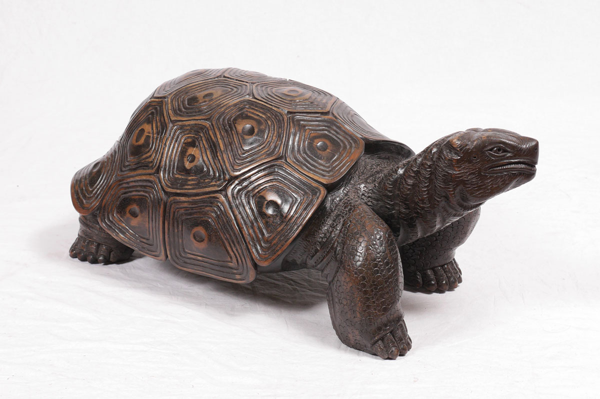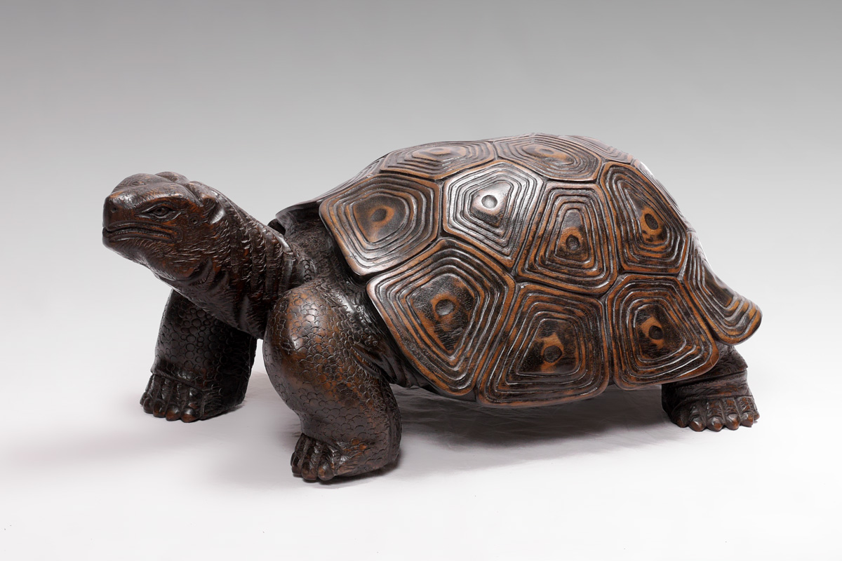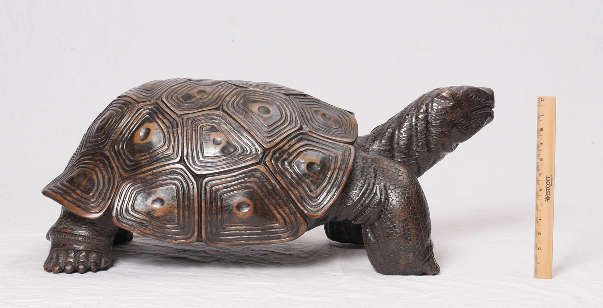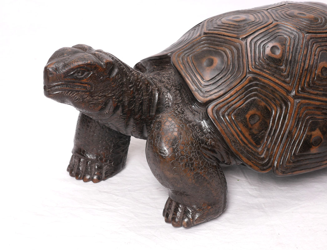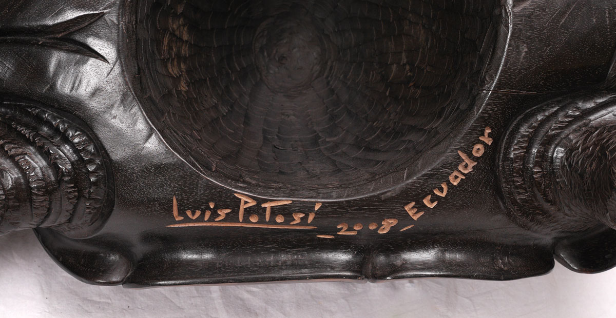 LUIS POTOSI LIFE SIZE CARVED WOOD TORTOISE: Figure of a tortoise walking, signed Luis Potosi 2008 Ecuador. Measures 13'' h. x 31'' x 14''.
