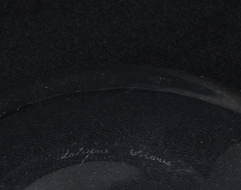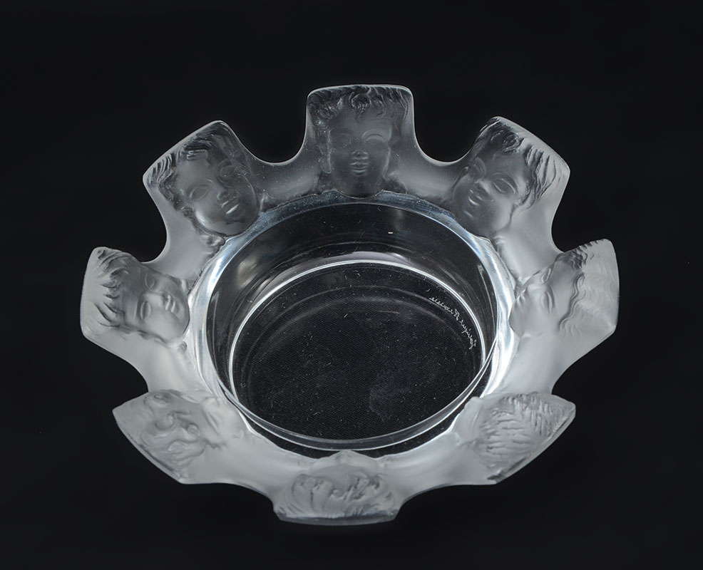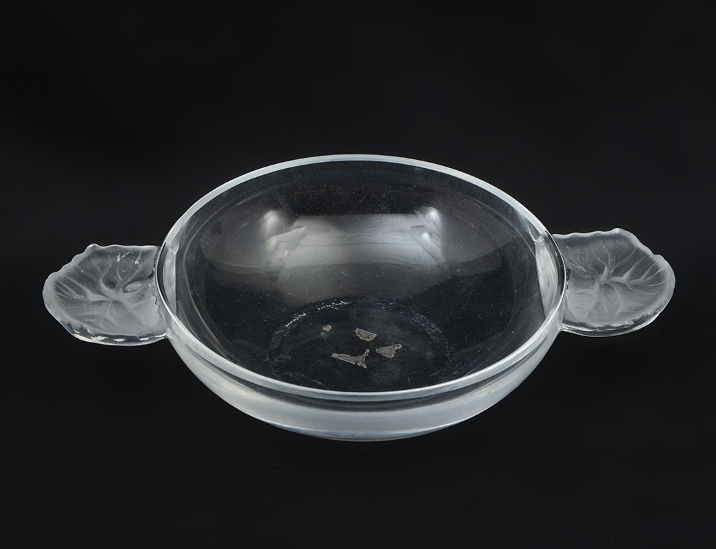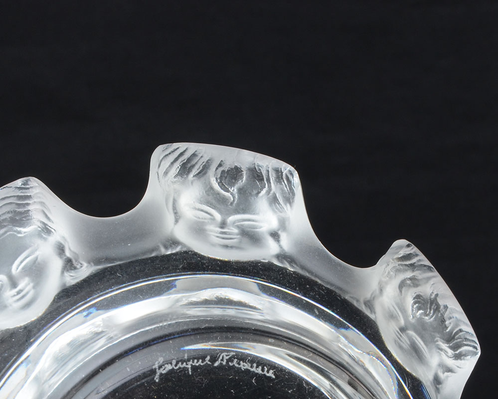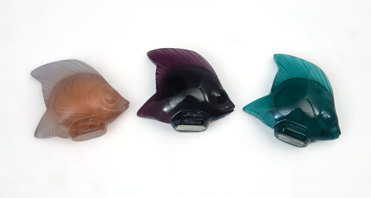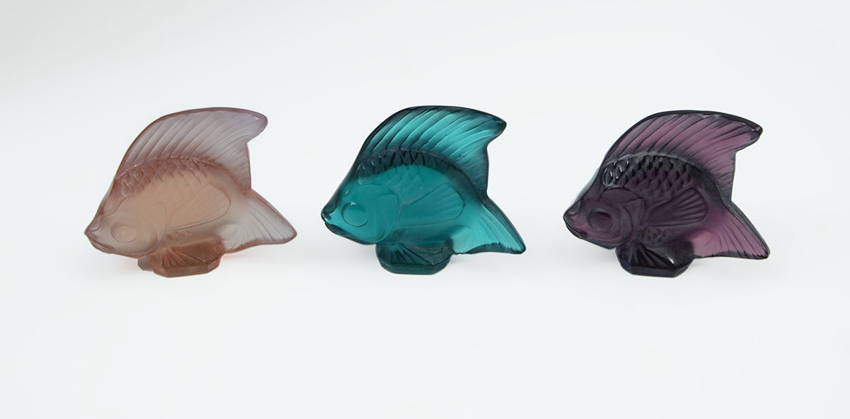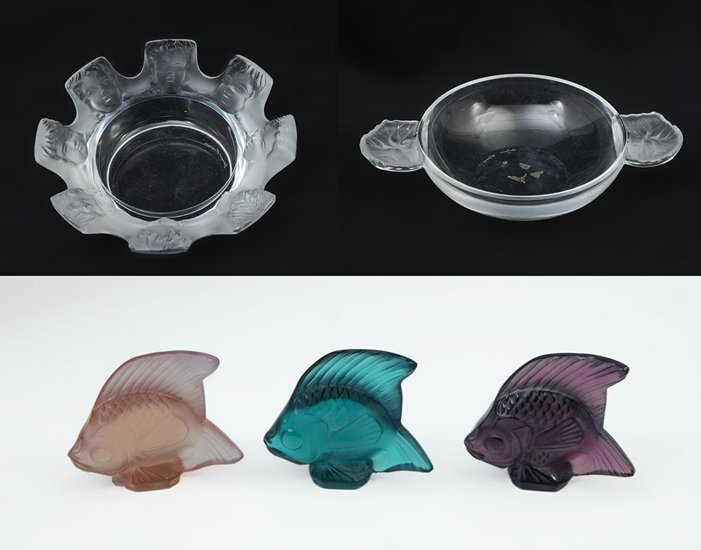 5 PIECE COLLECTION OF LALIQUE: 5 pieces total to include 1) Saint Nicholas tray, 1 1/2'' h. x 4 1/2''. 2) Double leaf handle dish, 5 7/8'' dia. 3-5) Amethyst, amber and blue fish, 3/4'' h.