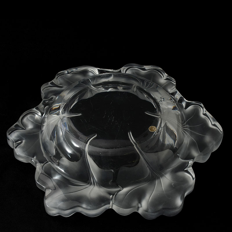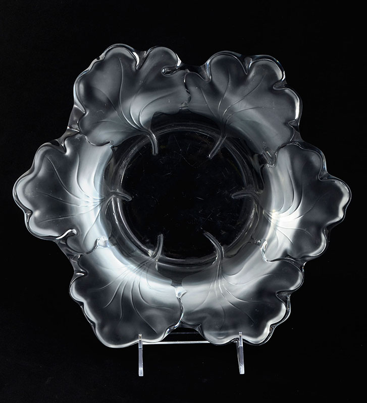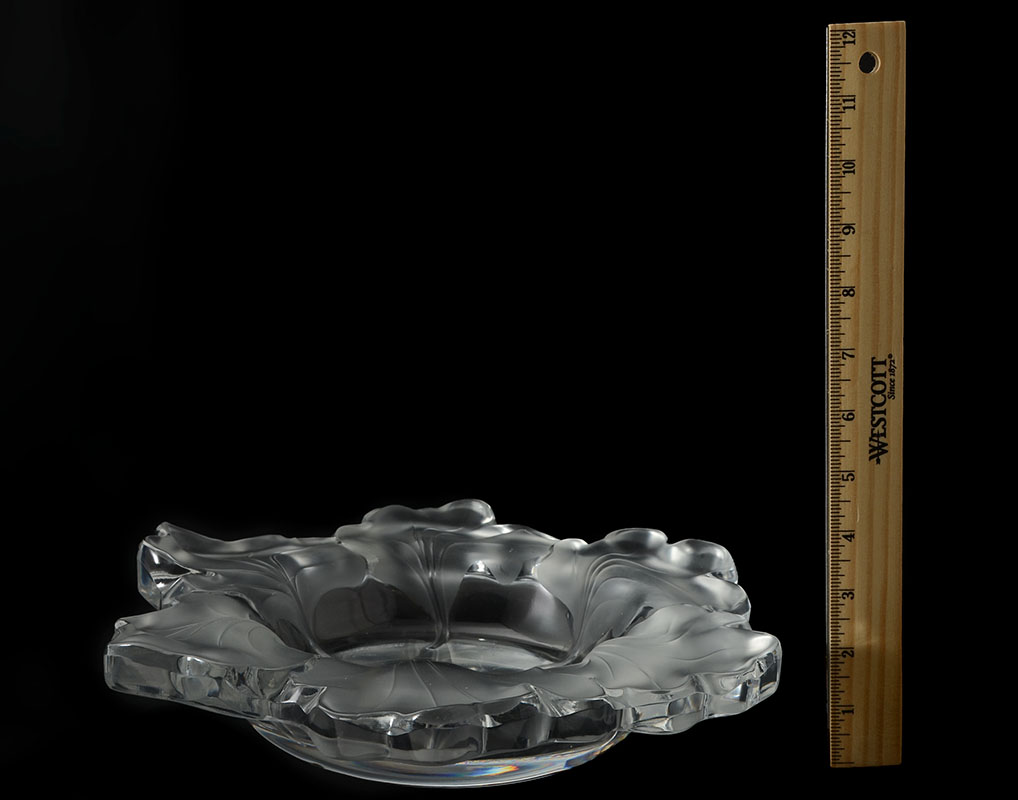 LALIQUE CAPUCINES FROSTED CRYSTAL BOWL: Molded and frosted leaves rim, clear center, signed Lalique France on base. Measures 2 1/4'' h. x 12 1/2''.