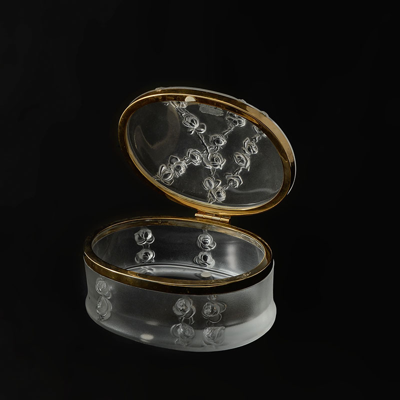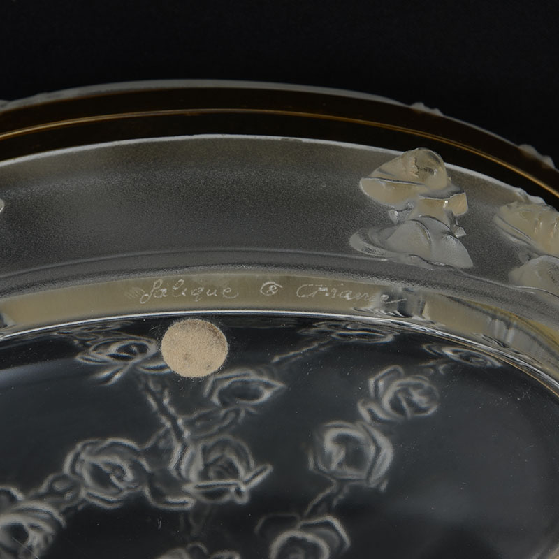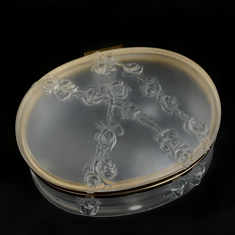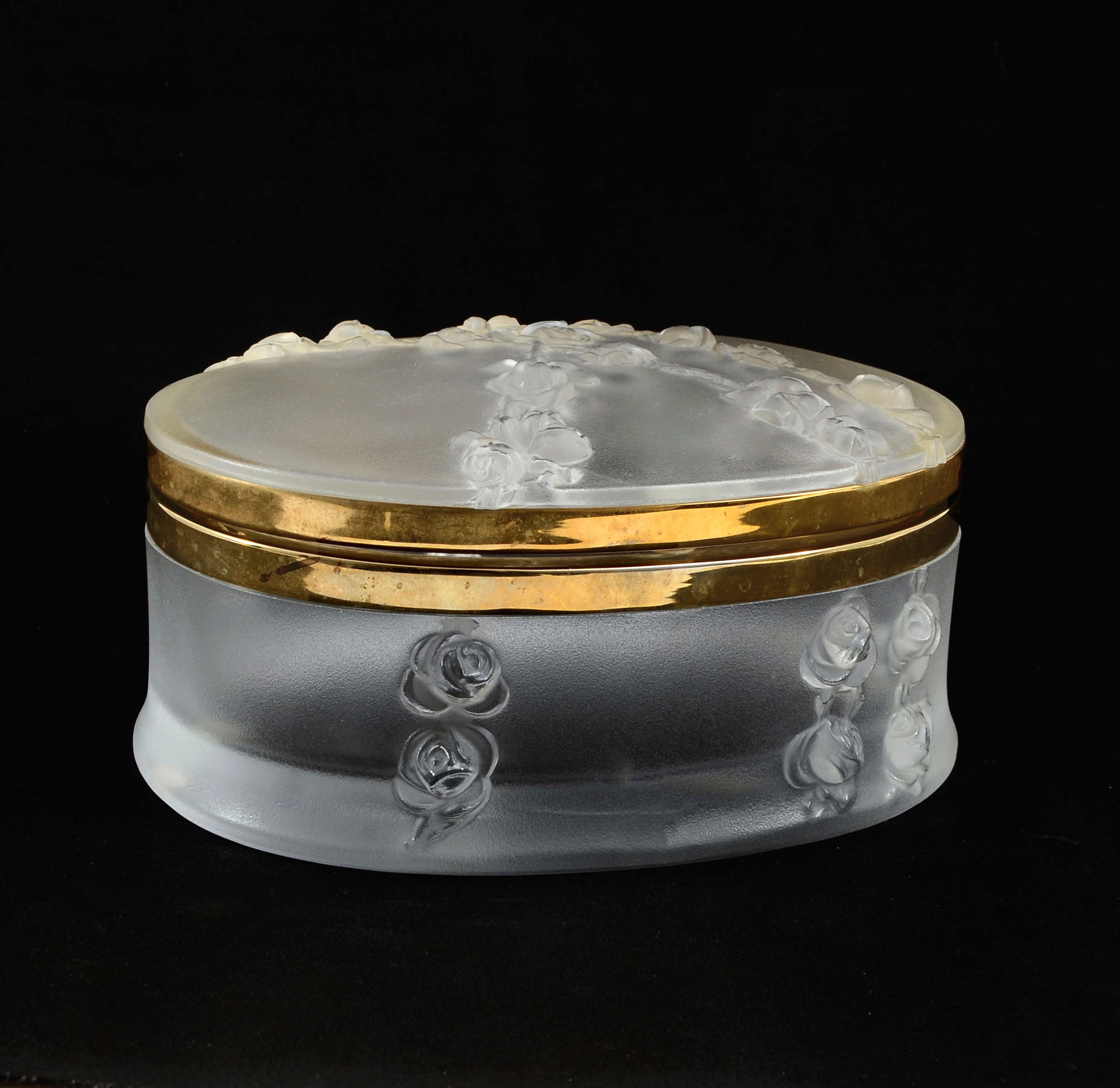 LALIQUE ROSES FROSTED DRESSER BOX: Molded frosted crystal with relief rose garland, brass bands, hinged lid. Signed Lalique France on base. Measures 3 1/2'' h. x 7'' x 6''.