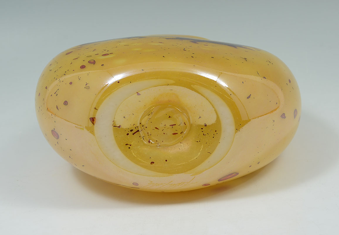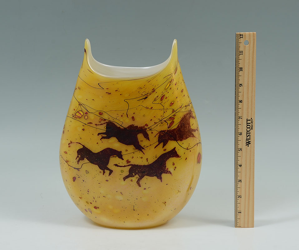 TANG HORSE ART GLASS VASE: Shape rim, mottled yellow ground, 4 figural tang horses either side, illegibly signed on base. Measures 11 3/4'' h. x 8 3/4'' x 4''.