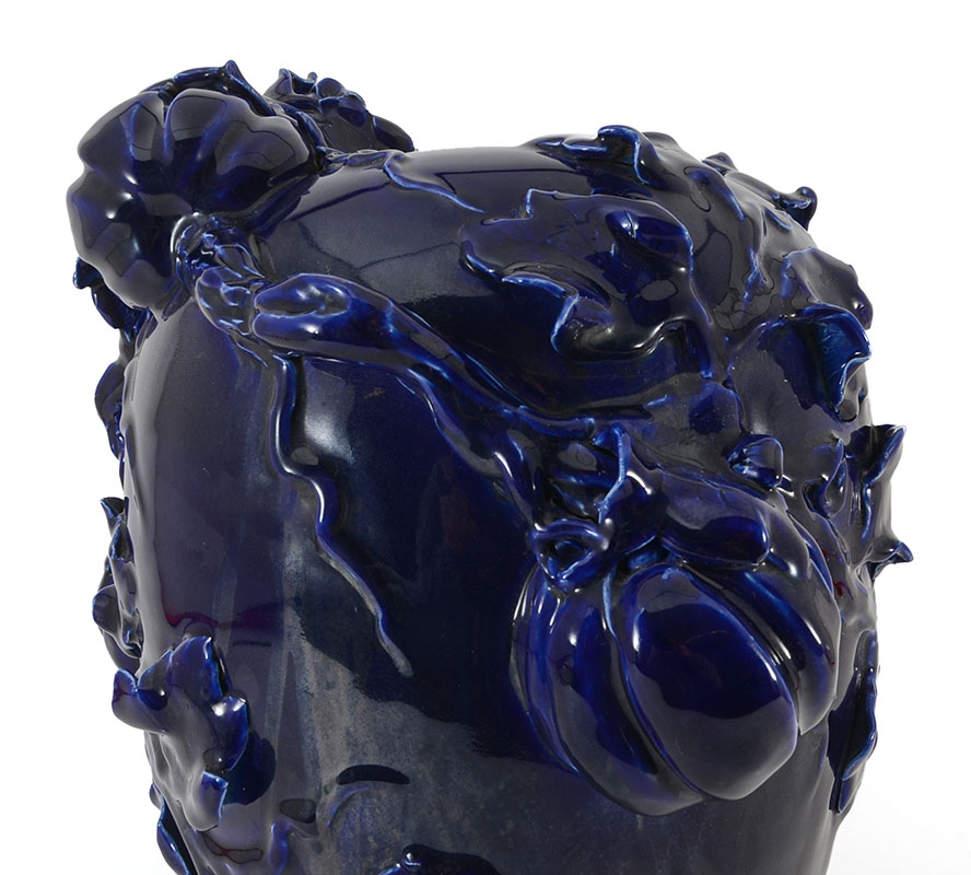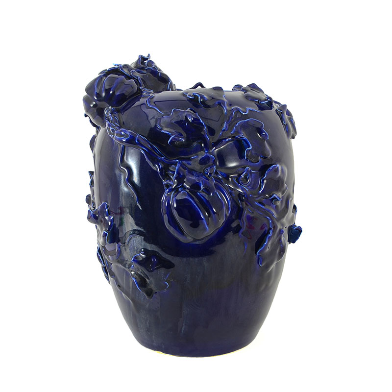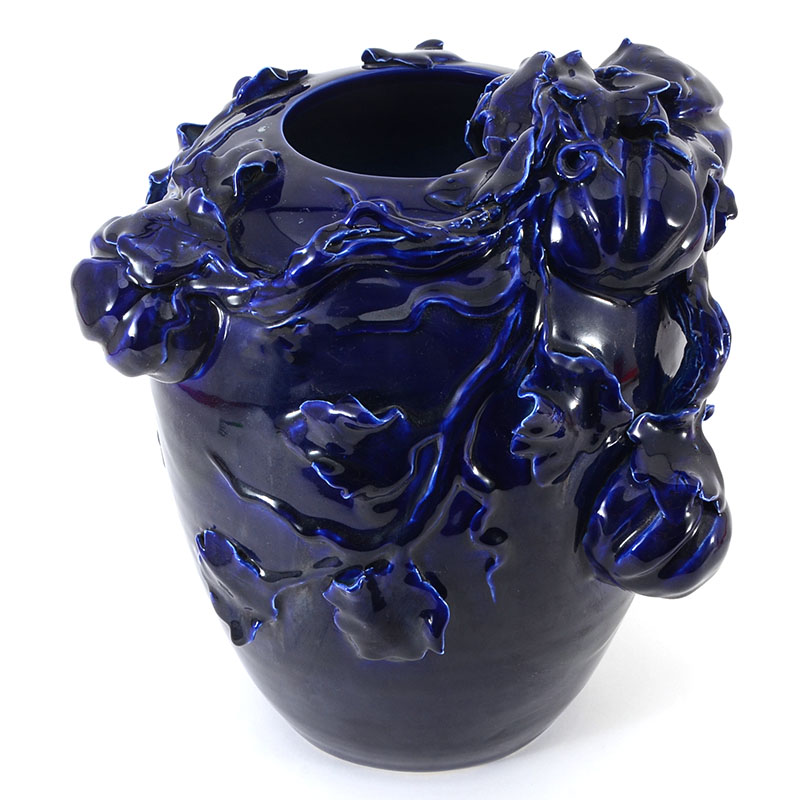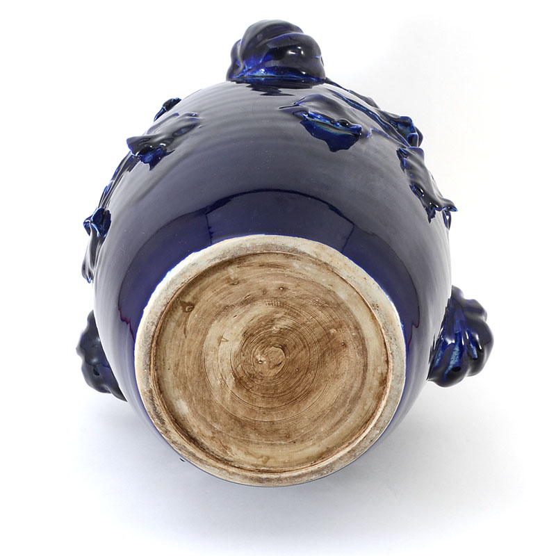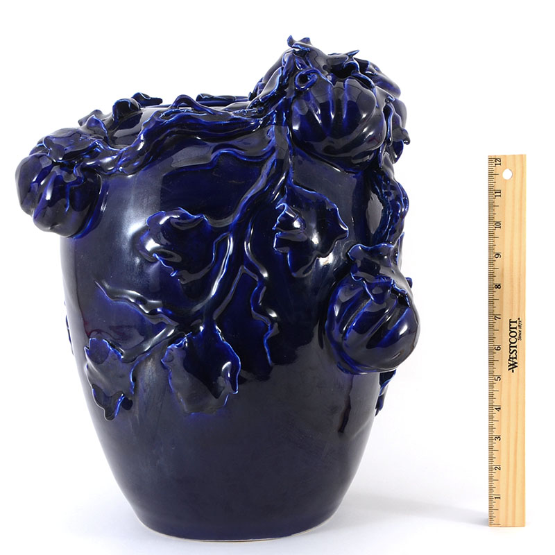 LARGE COBALT GLAZE HIGH RELIEF VASE: High relief gourd or fruit vine motif, cobalt glaze all over, no visible marking but most likely Chinese. Overall 15 3/4'' h. x 13'' dia.