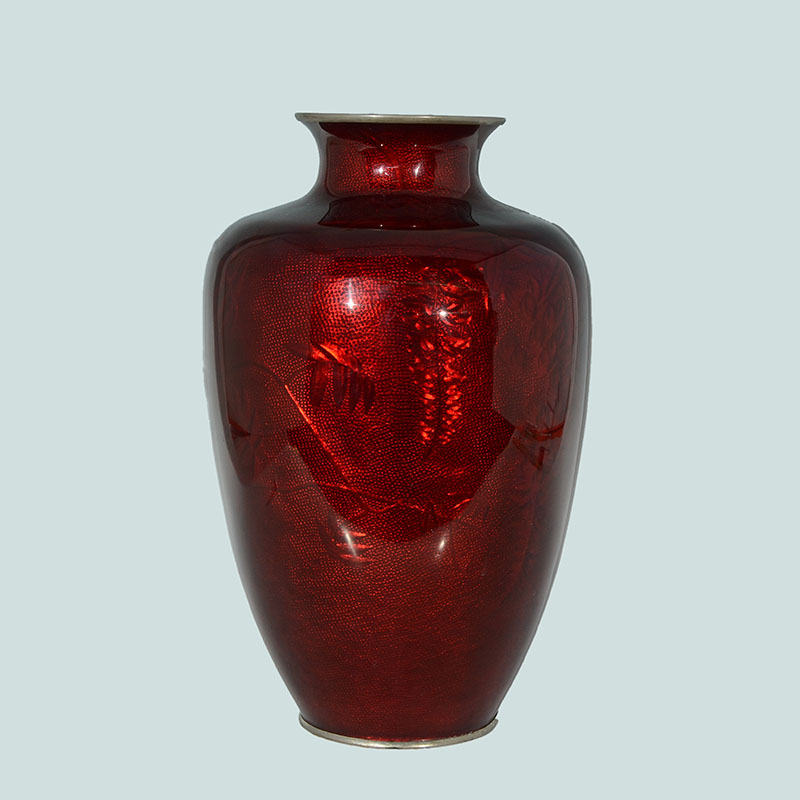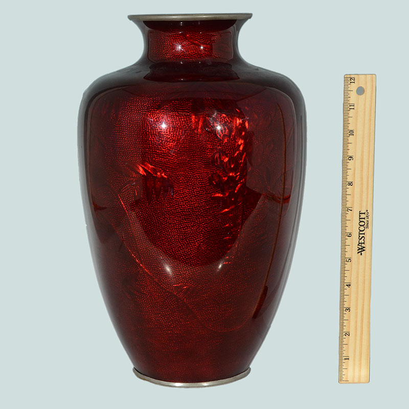 LARGE PIGEON BLOOD JAPANESE FOIL CLOISONNE VASE: Pigeon blood red ground with foliate foil motif, signed on base, 14 1/2'' h. x 9''.