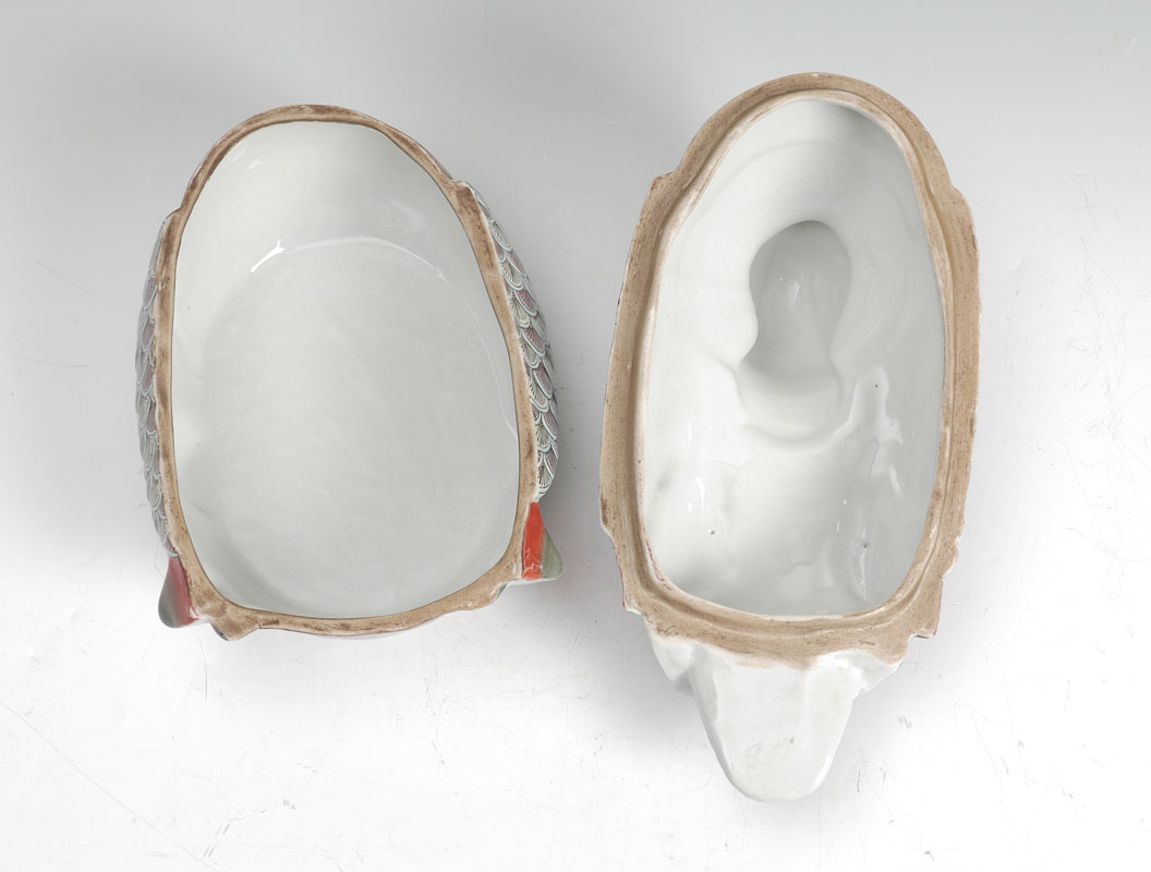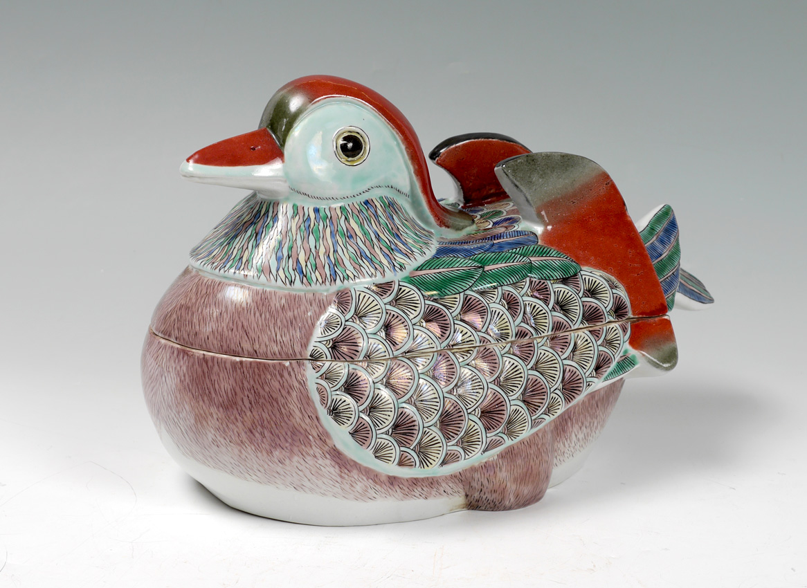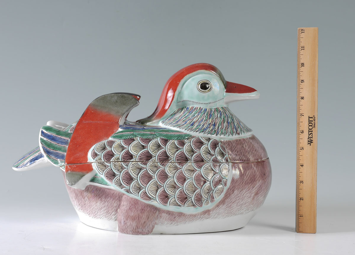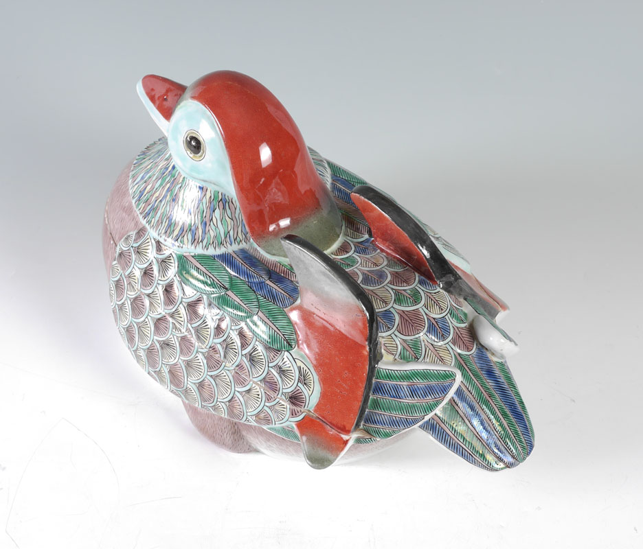 CHINESE EXPORT POLYCHROME DUCK COVERED TUREEN: Polychrome earthenware duck form tureen, unsigned, overall measures 9 3/4'' h. x 16 1/2'' x 10''.