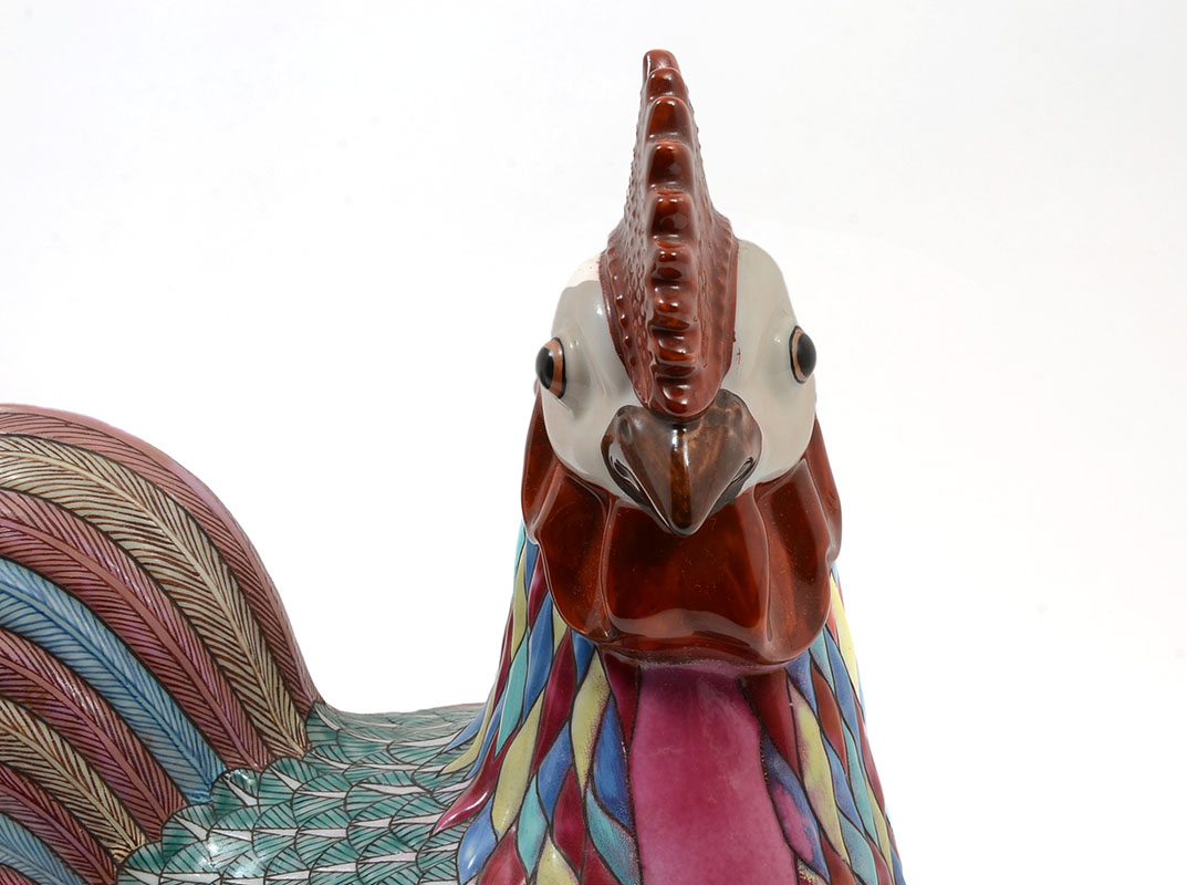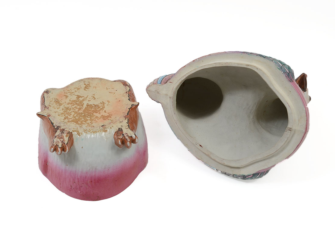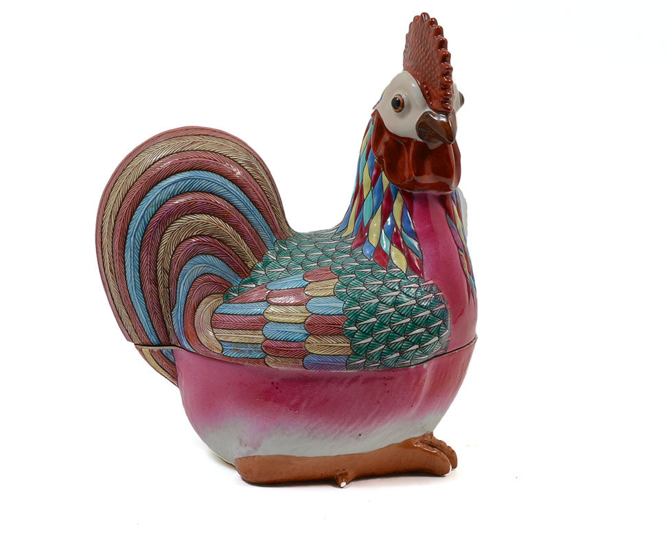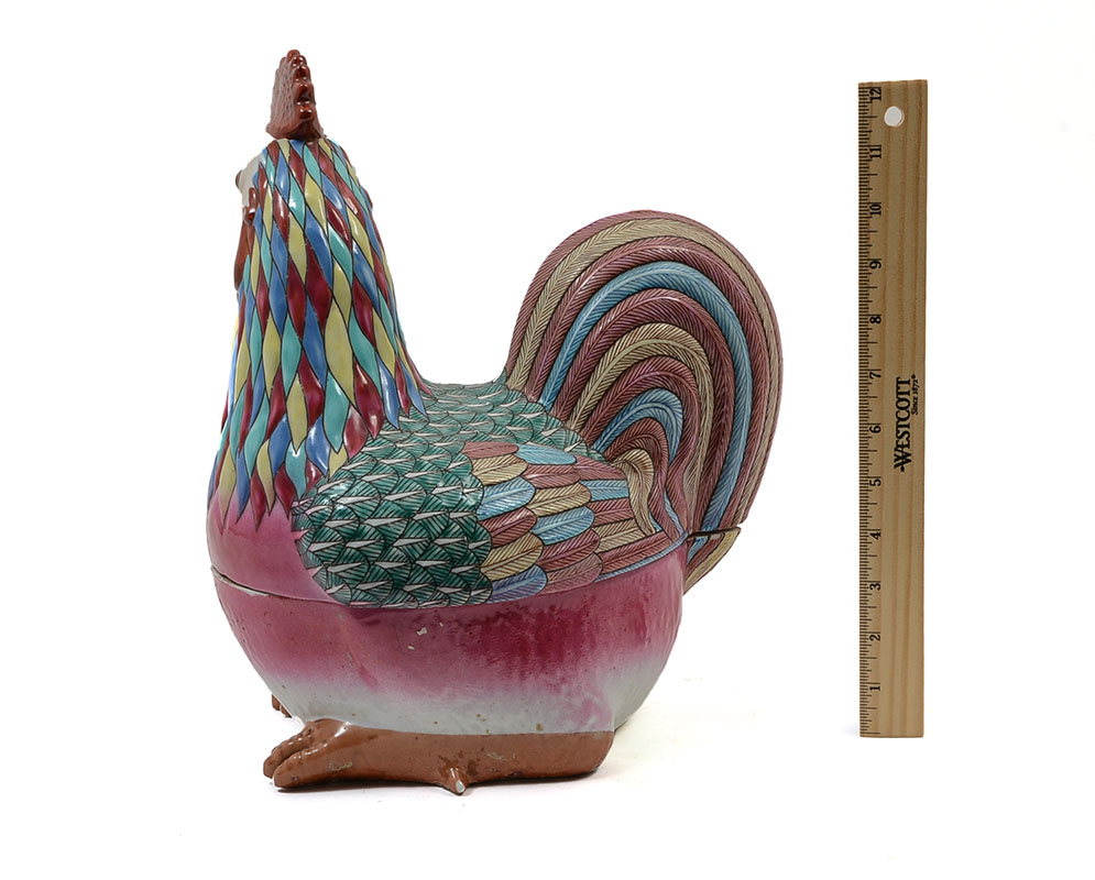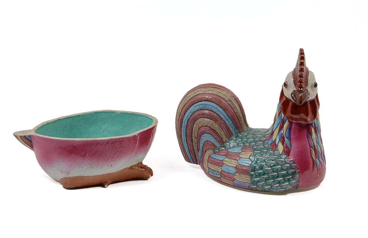CHINESE EXPORT POLYCHROME ROOSTER COVERED TUREEN: Polychrome earthenware rooster form tureen, unsigned, overall measures 13 1/4'' h. x 11 1/4'' x 7 1/4''.