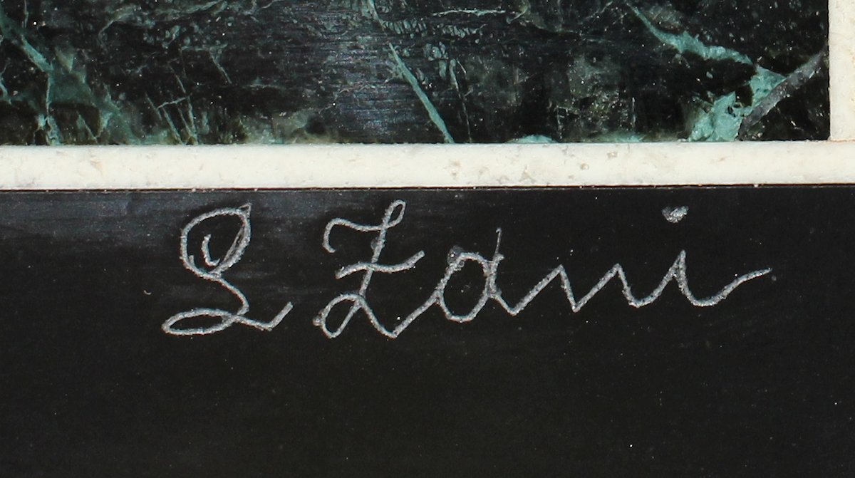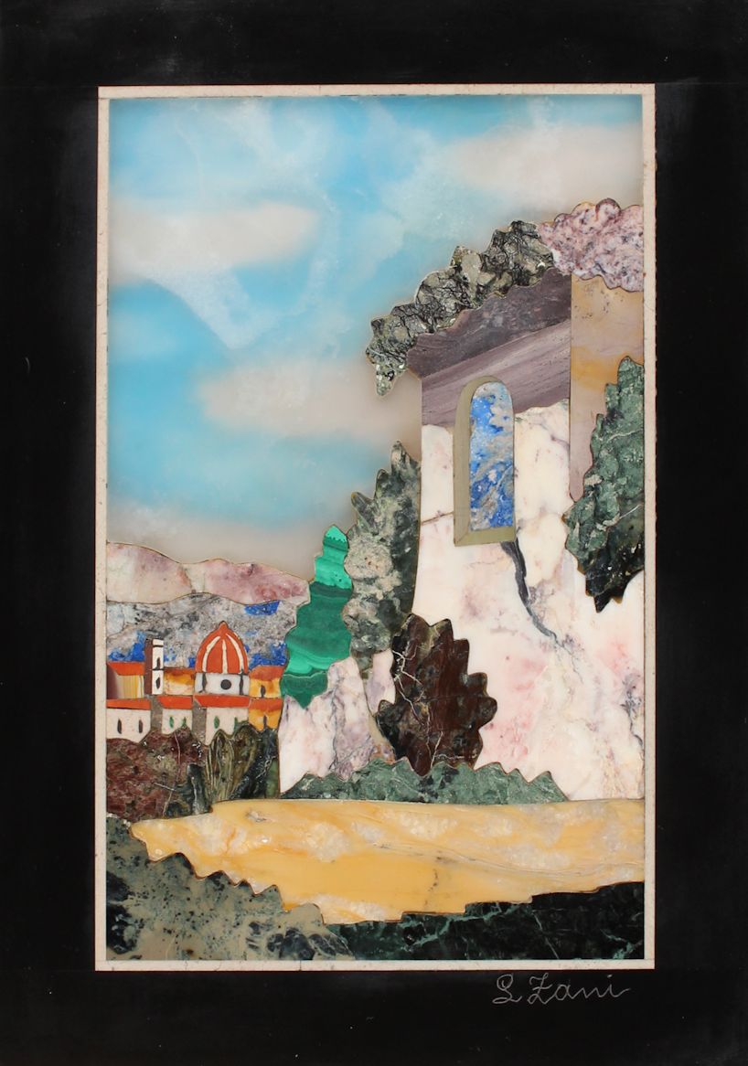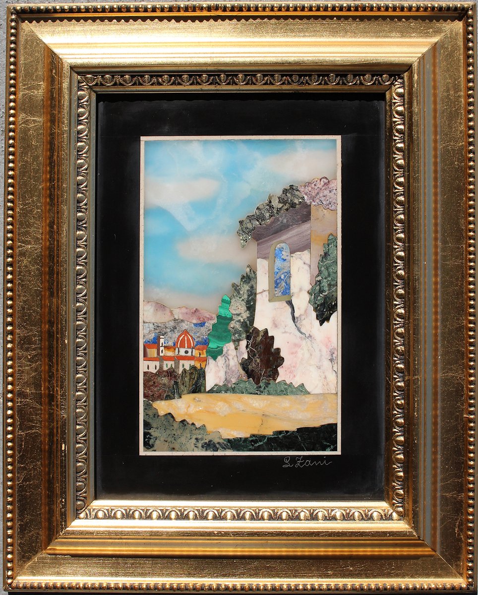 SIGNED ITALIAN PIETRA DURA LANDSCAPE: 8.75'' x 6.5'', signed lower right, framed, 12'' x 9.75''.
