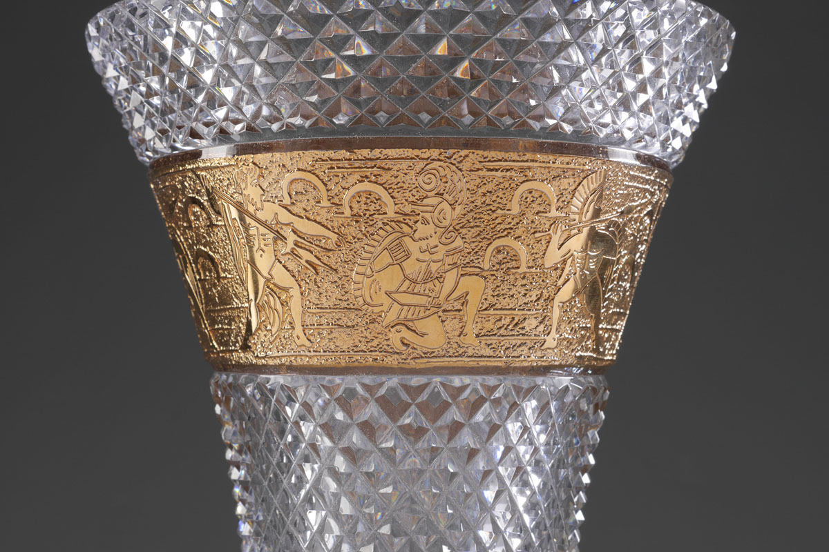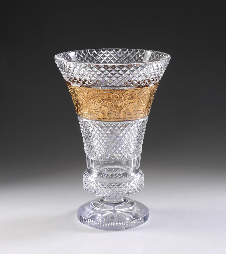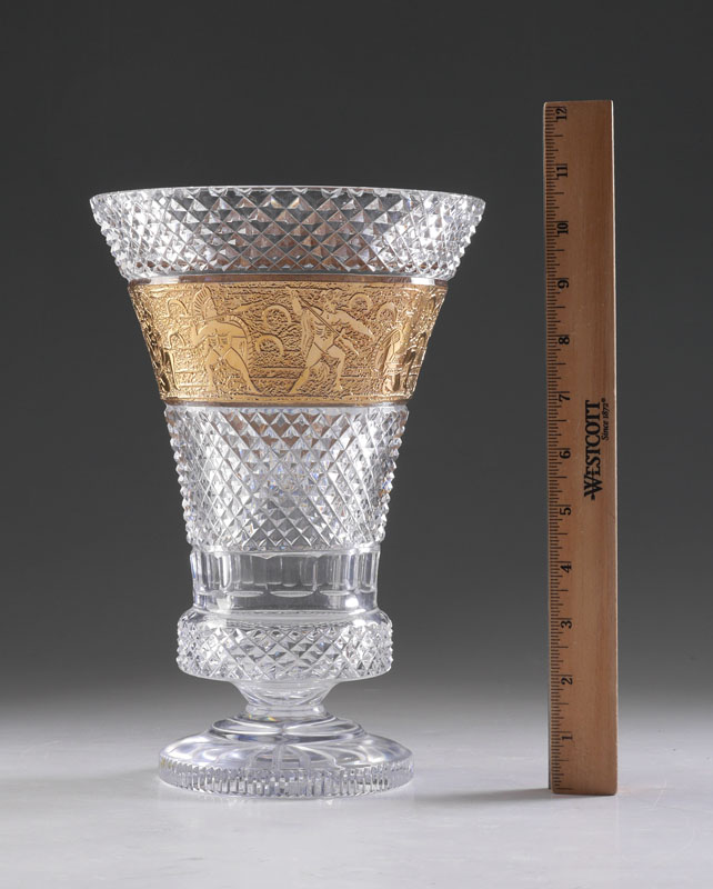 MOSER CUT GLASS CAMEO FRIEZE PANEL VASE: Unsigned, attributed Moser, cut glass body on footed base, gilt frieze band with neo-classical motif. Overall measures 10 3/4'' h. x 7 1/4''.