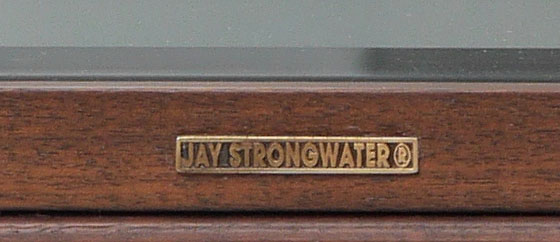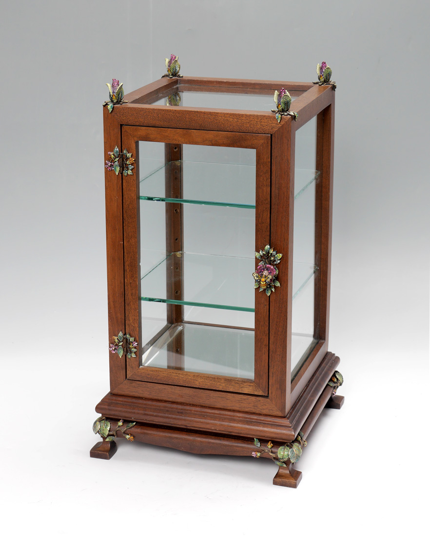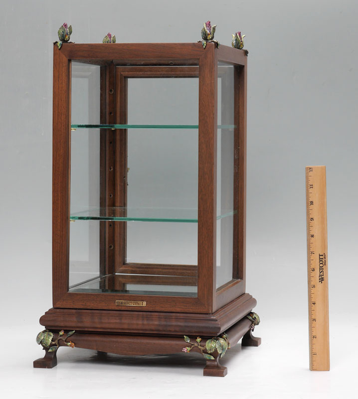 JAY STRONGWATER DISPLAY CASE: Table top display case with enamel flower finials, hinged and door pull, glass on all 4 sides and top footed base with flower decoration continuing. Metal tag on back, overall 21'' h. x 12'' x 12''.