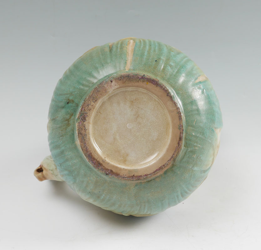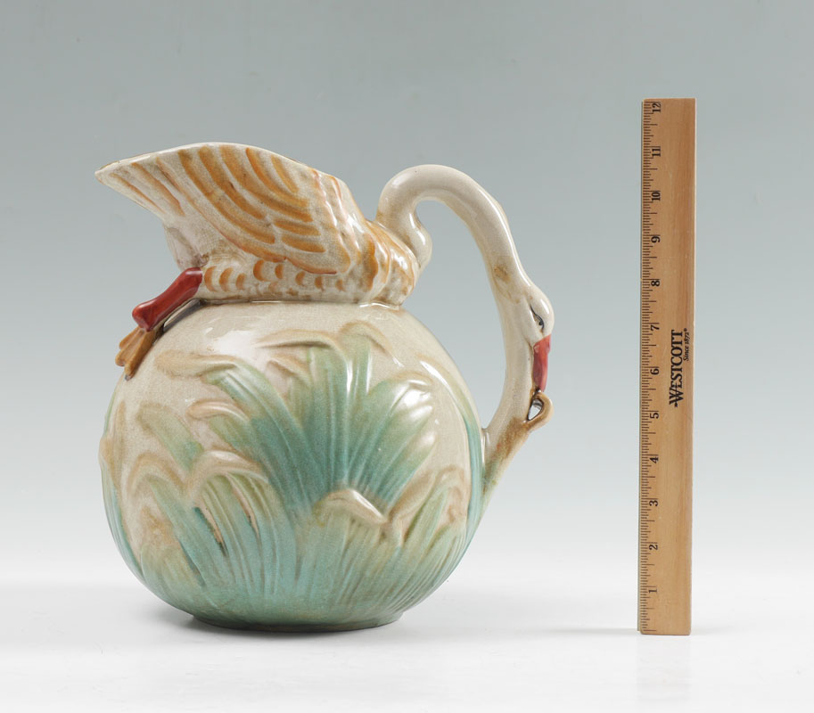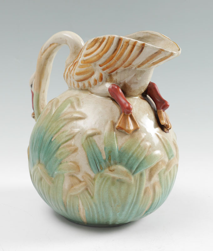 CRACKLE GLAZE SWAN FORM MAJOLICA PITCHER: Unmarked, body of swam form the rim and spout, head begins the handle, body of pitcher with foliate motif, overall measures 10 3/4'' x 10 1/2''.