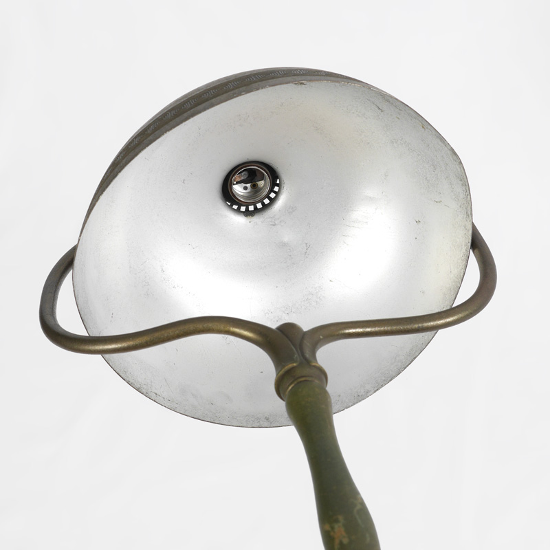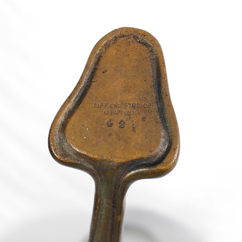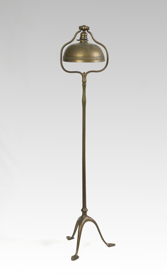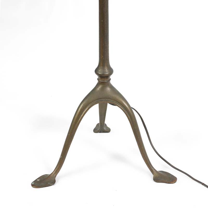 TIFFANY STUDIOS BRONZE FLOOR LAMP #423: Patinated bronze floor base, splayed legs ending with leaf form feet, stamped ''Tiffany Studios, New York, 423'', measures 55 1/2'' h. x 14'' base dia. Patinated metal shade with Greek key design, 4 1/2'' h. x 10 1/4'' dia.